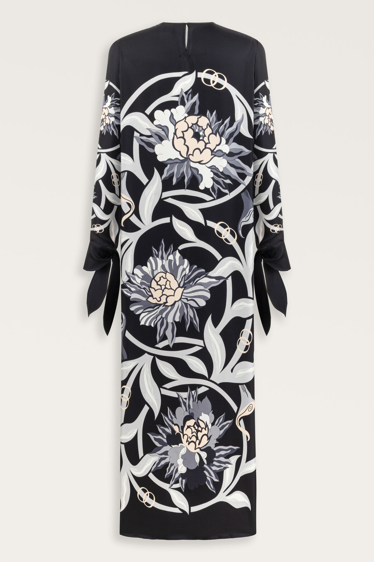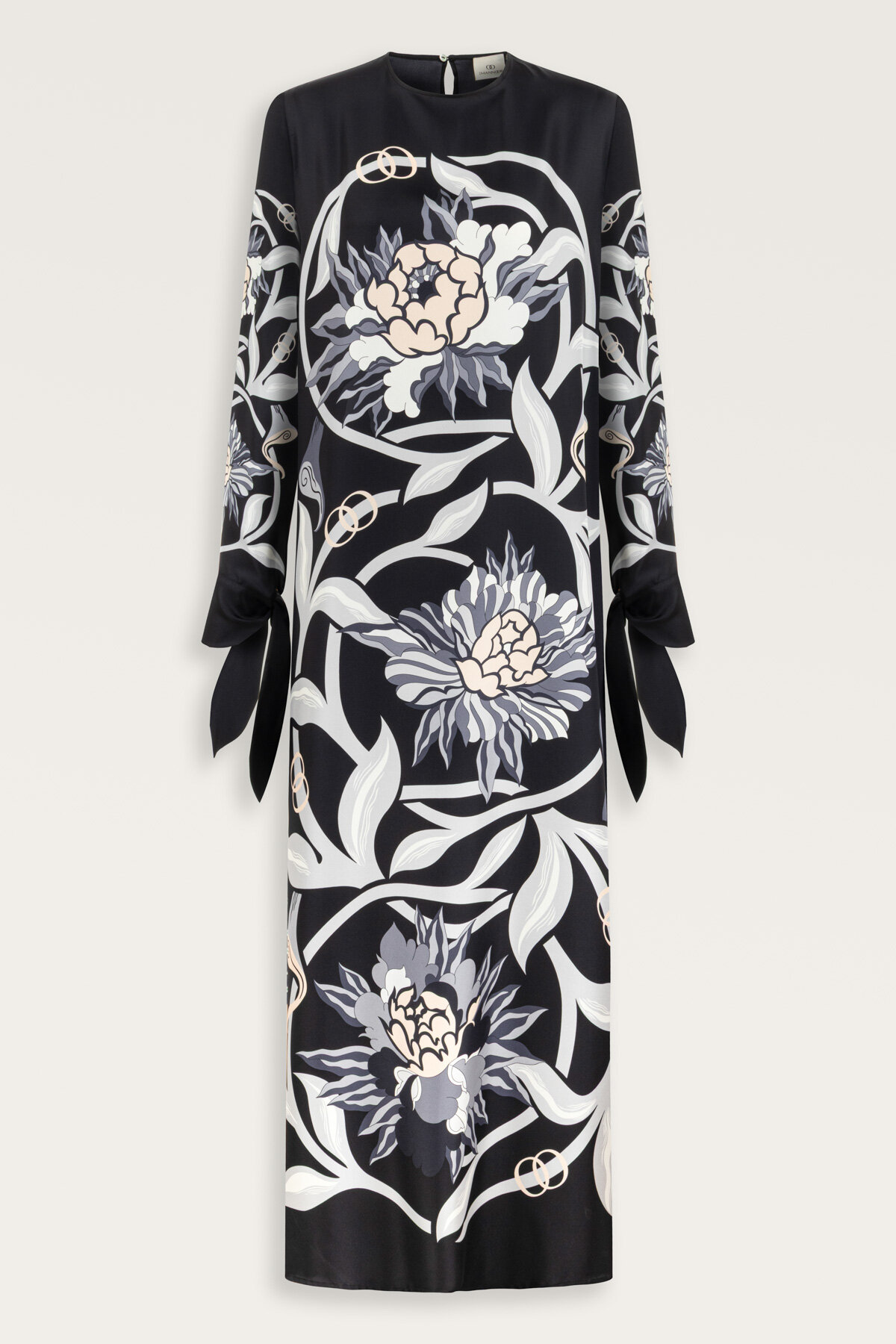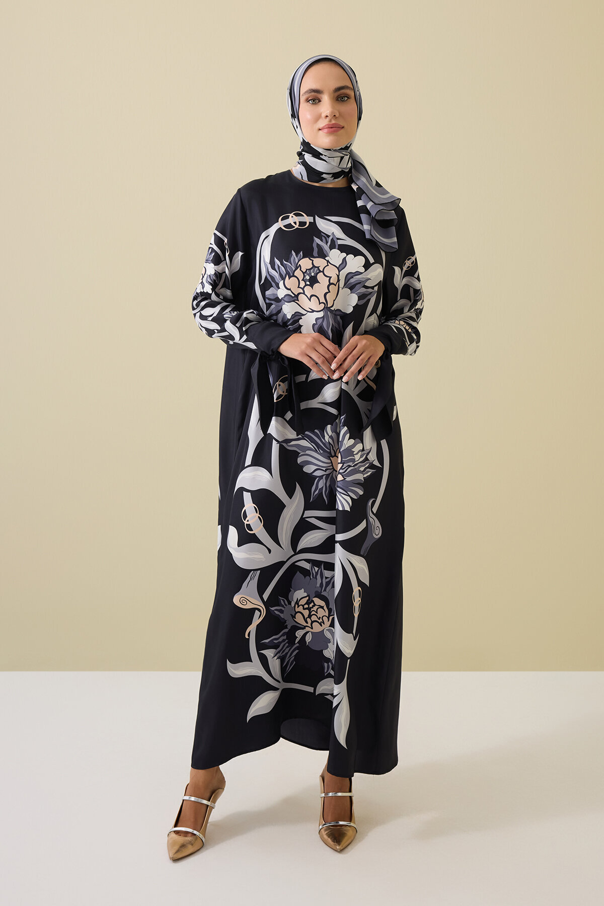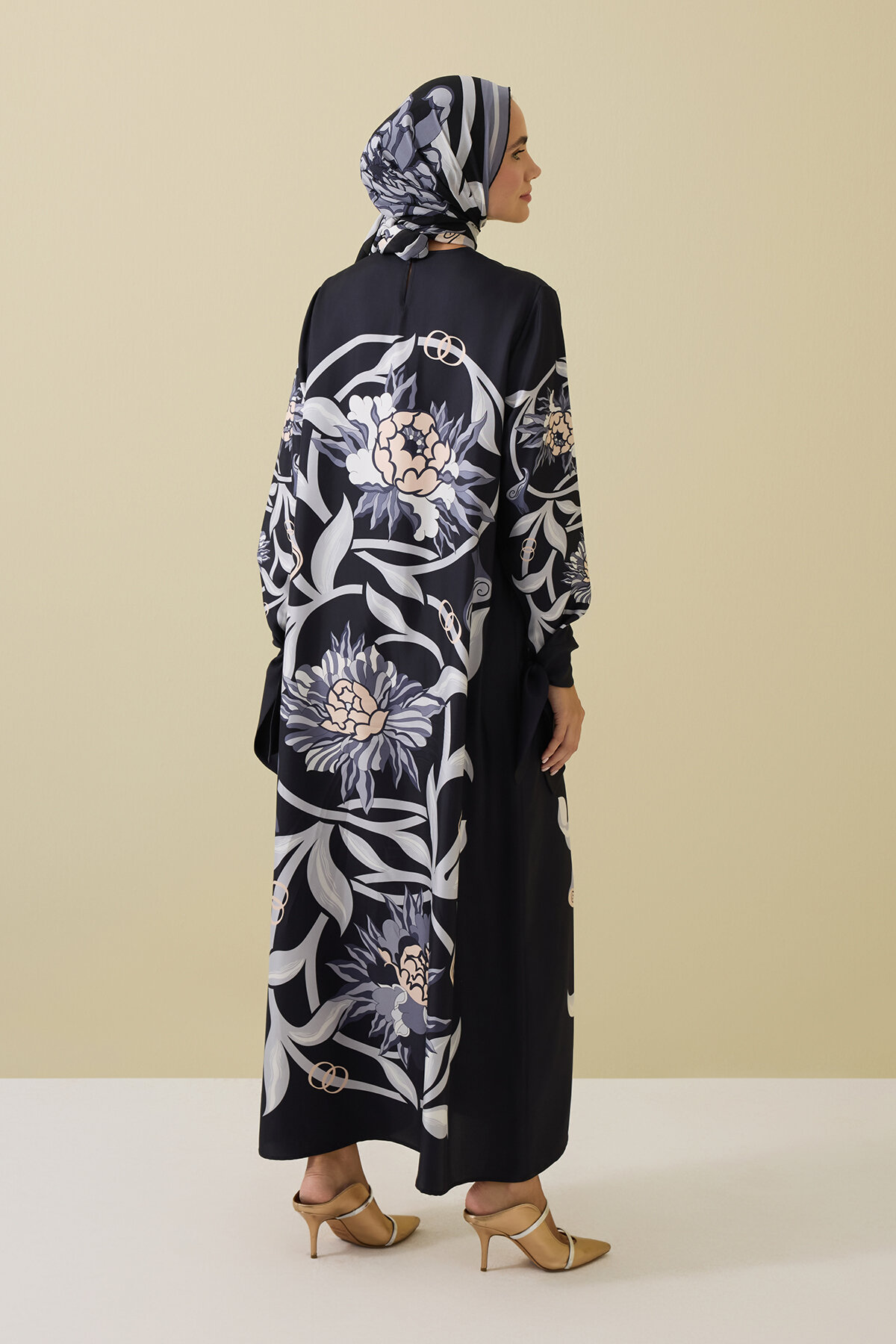 İmannoor’un doğadan ilham alan zarif çizgileriyle şekillenen Çiçek Yolu Manşet Detaylı İpek Elbise, feminen duruşu ve %100 saf ipek dokusuyla sofistike bir şıklık sunar.