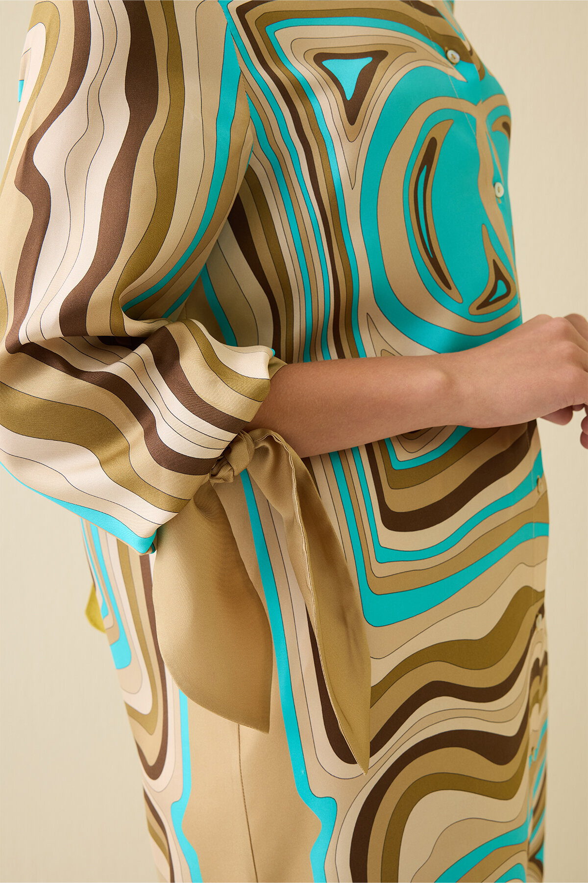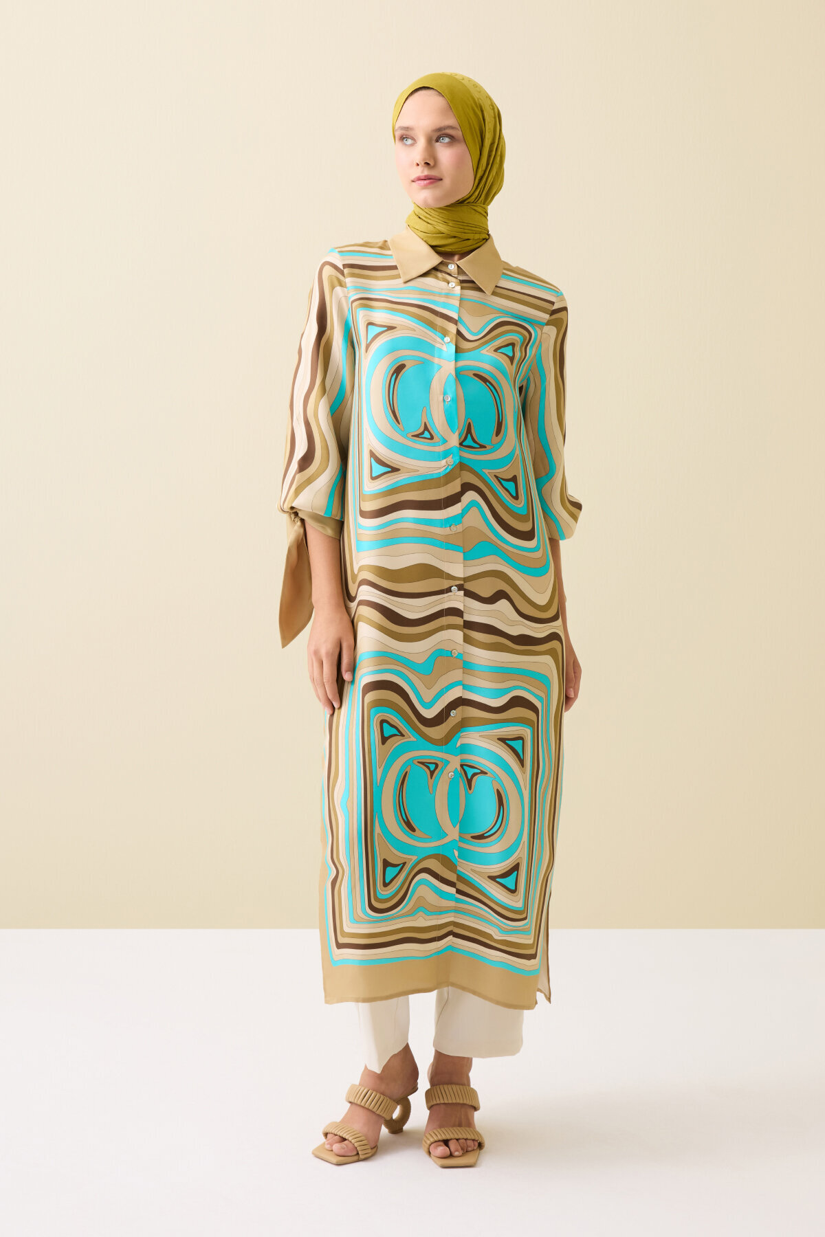 Dalgaların İçinde İpek Gömlek Elbise ile stilinizde hem dinginliği hem de sofistike şıklığı bir arada taşıyın.