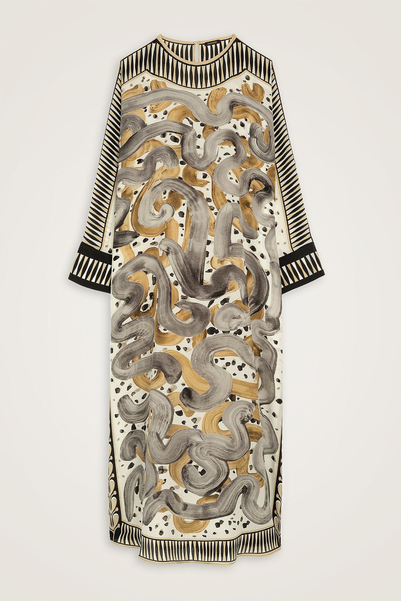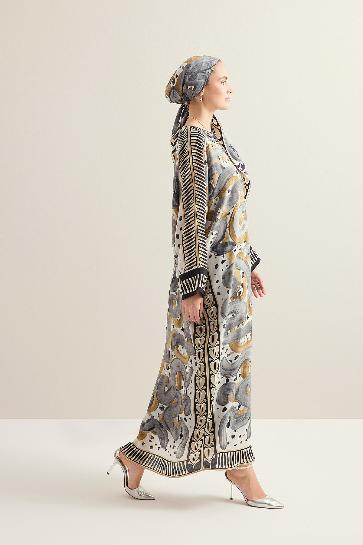 Dere Yolu deseninin akışkan ve zarif çizgilerini taşıyan bu krep ipek kaftan, pürüzsüz dokusu ve hafif yapısıyla konforlu bir kullanım sunar. Krep ipeğin doğal parlaklığı tasarıma sofistike bir ışıltı kazandırırken, dökümlü formu hareketli ve zarif bir siluet oluşturur. Hem günlük kombinlerde hem de özel anlarda şıklığı zahmetsizce tamamlayan bu kaftan, zamansız ve güçlü bir stil ifadesi sunar.