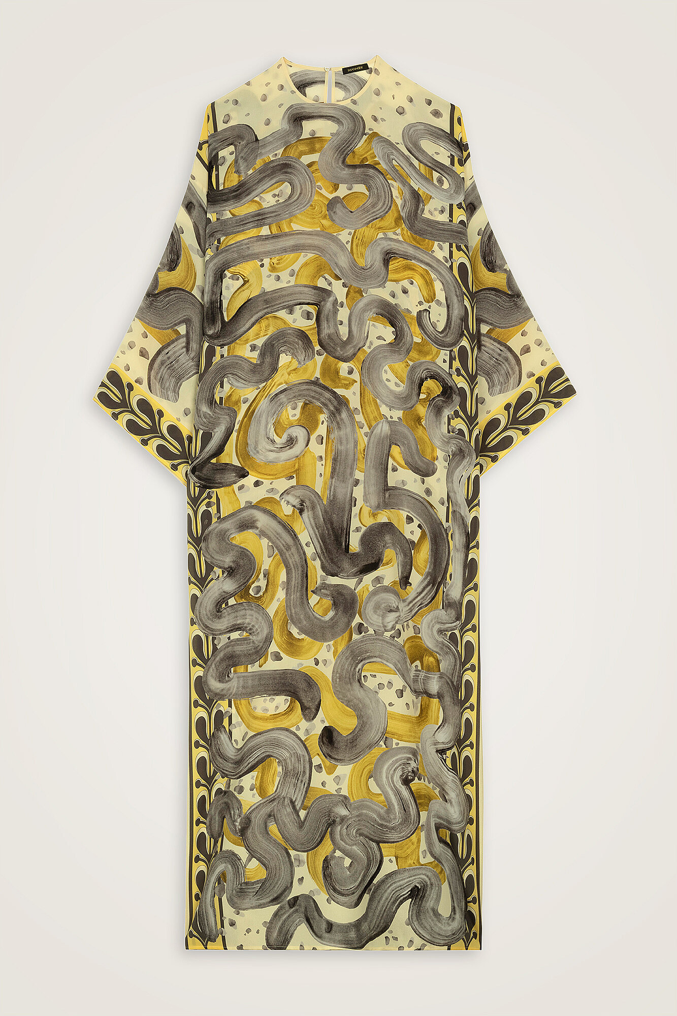 Dere Yolu Sarı-Gri Krep İpek Elbise