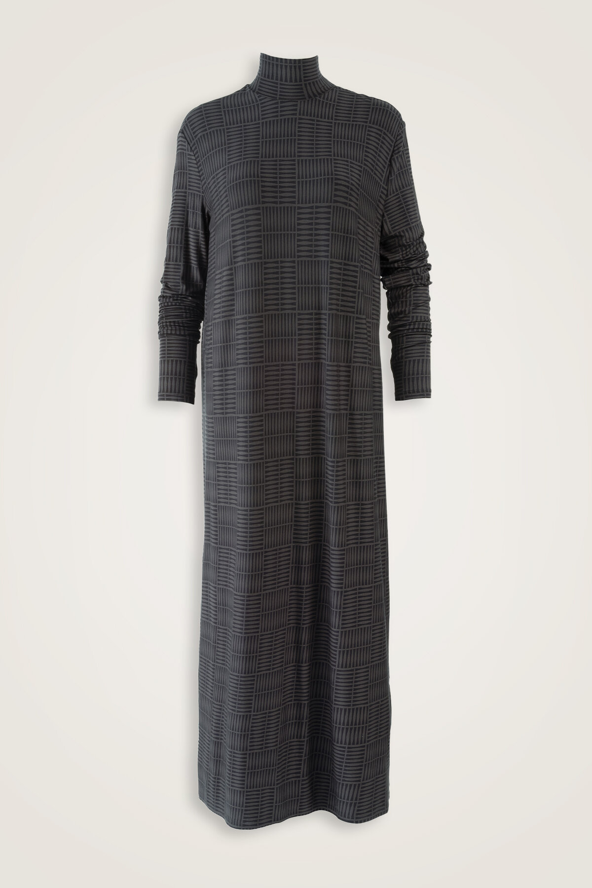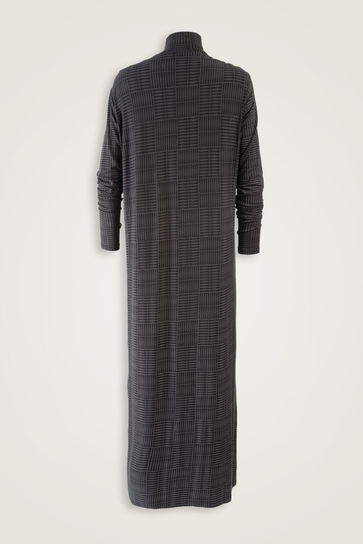 Doğal dokuların zarafetle buluştuğu bu elbise, İmannoor koleksiyonunun modern ve rahat şıklığını temsil eder.