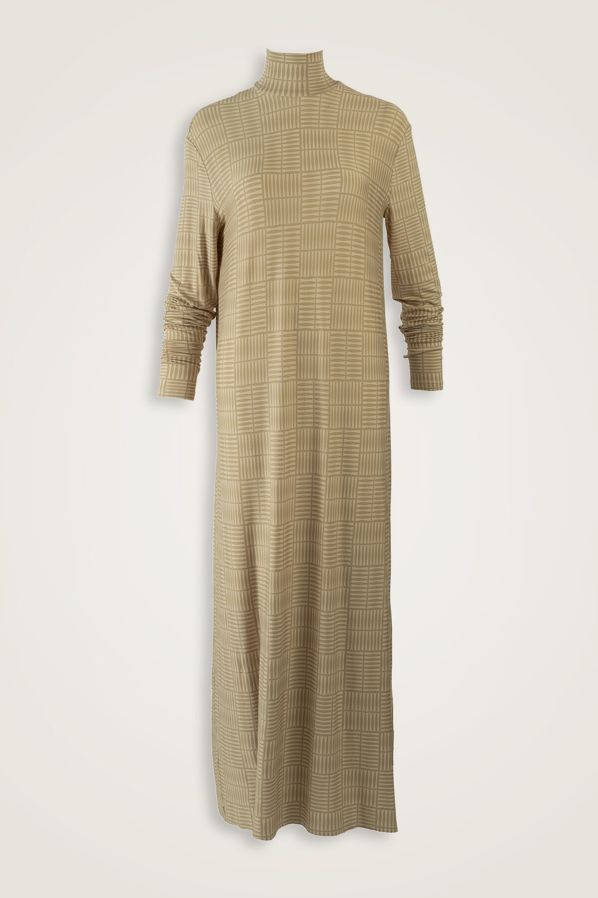 Doğal dokuların zarafetle buluştuğu bu elbise, İmannoor koleksiyonunun modern ve rahat şıklığını temsil eder.