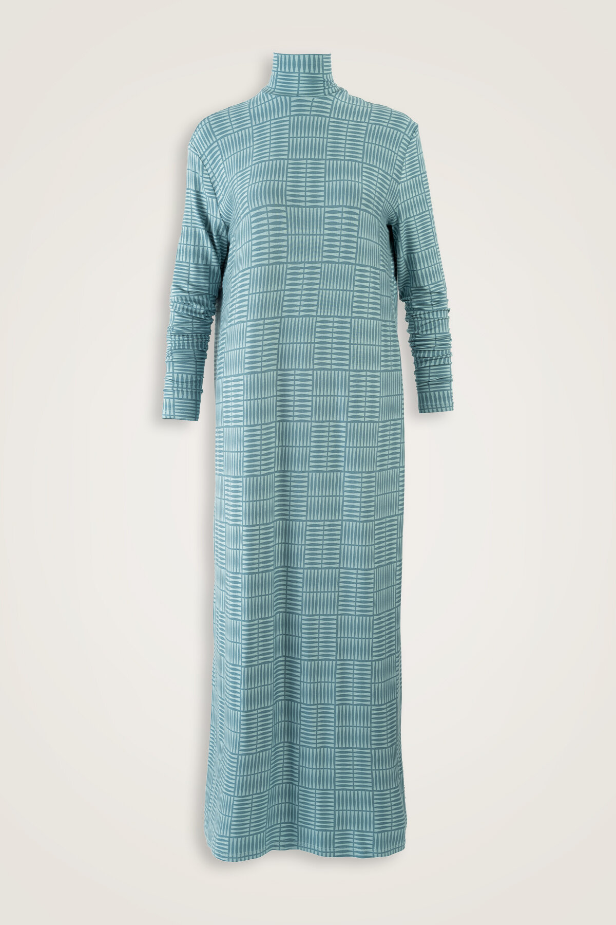 Doğal dokuların zarafetle buluştuğu bu elbise, İmannoor koleksiyonunun modern ve rahat şıklığını temsil eder.