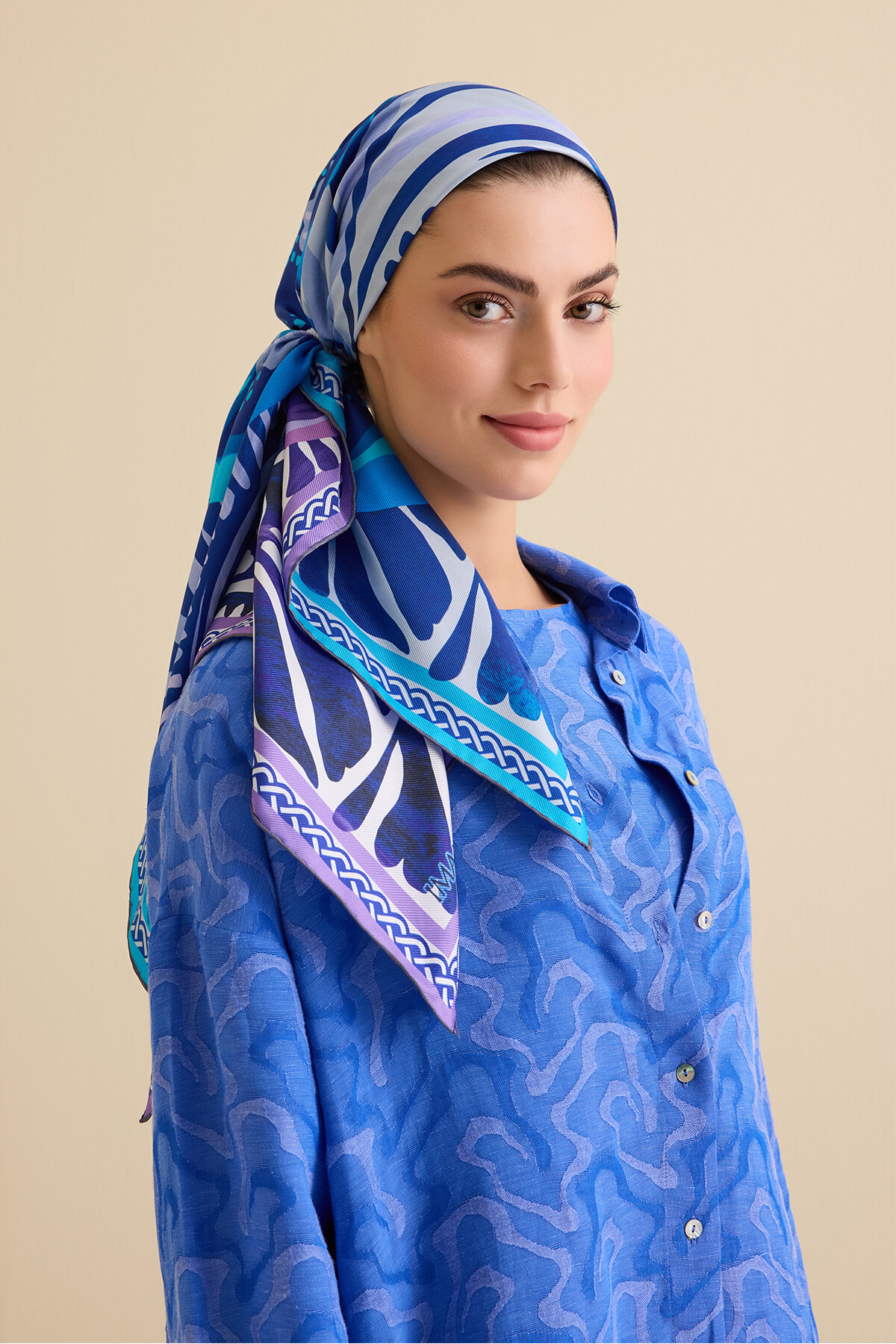 Çift taraflı tasarımı sayesinde farklı kombinlerde, tek parça ile iki ayrı görünüm elde edebilirsiniz. 94x94 cm ölçüsüyle boyun, baş, çanta ya da bilek aksesuarı olarak rahatlıkla kullanılabilir.