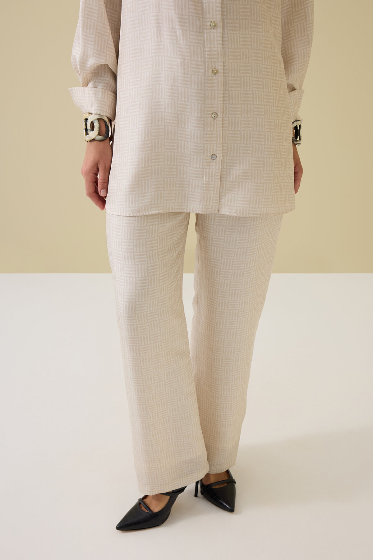 İman Kare Dokulu İpek Pantolon ile doğallığın zarif çizgilerini stilinize taşıyın.
