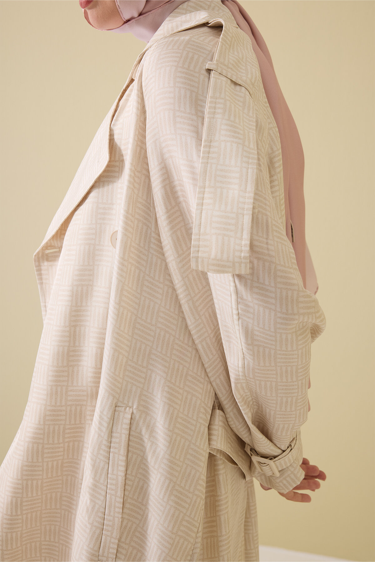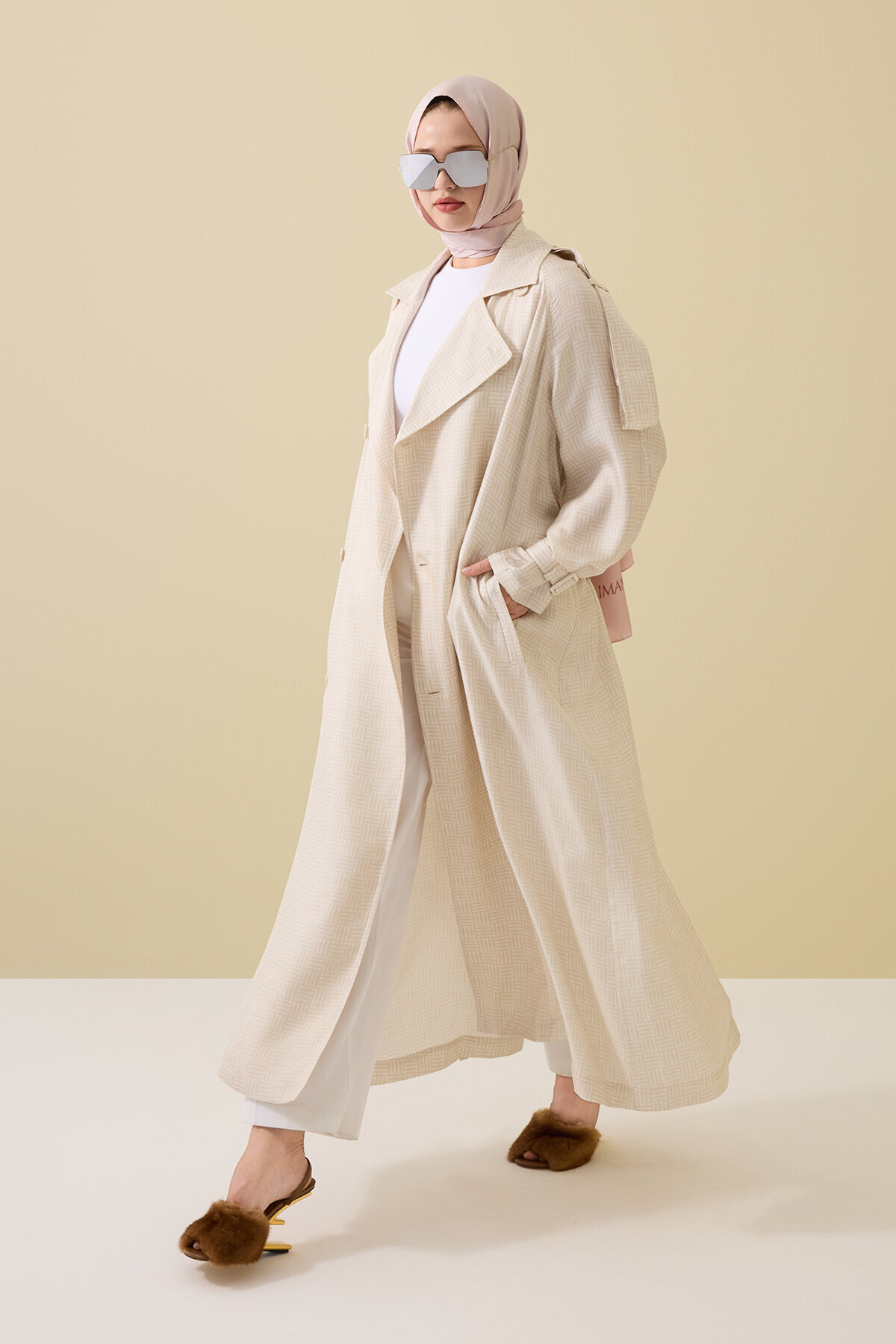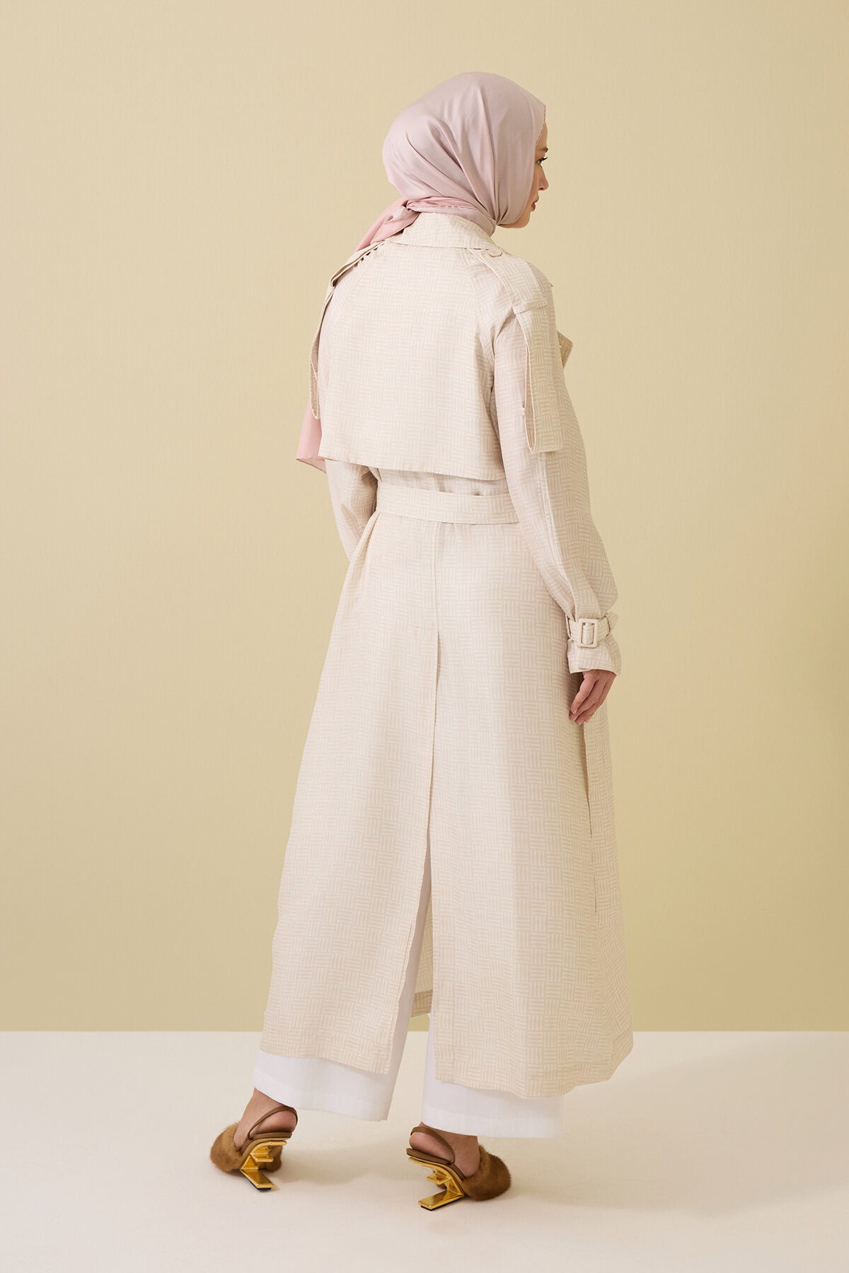 İman Kare Dokulu İpek Trençkot ile dış giyimde ipeğin zarafetini ve dokunun modern gücünü keşfedin.
