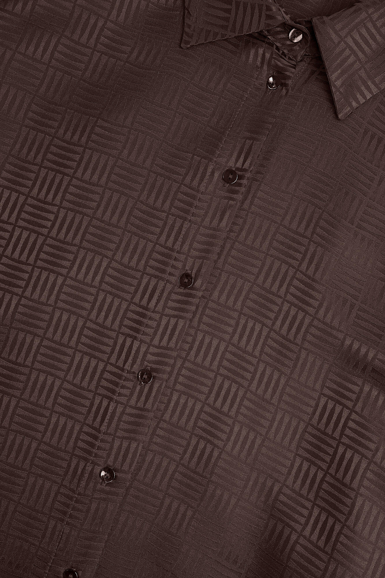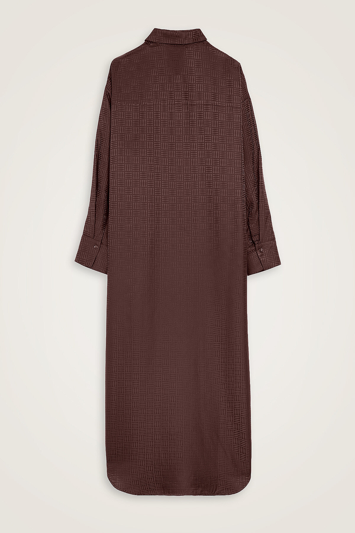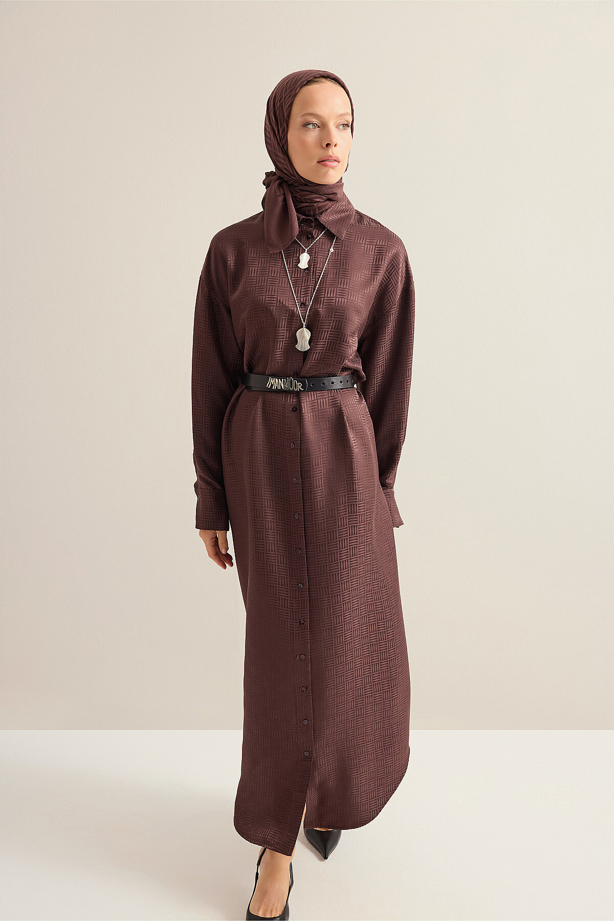 İmannoor’un zarif ve güçlü tasarım anlayışını yansıtan %100 jakarlı ipek İman Kare Jakarlı İpek Gömlek Elbise, jakarlı dokumanın kendine özgü dokulu yüzeyi ve ipeğin doğal parlaklığı sayesinde vücutta sofistike ve dengeli bir duruş sunar; kare desenli özel tasarımıyla stile modern ve karakterli bir ifade kazandırırken, gömlek elbise formu zamansız ve rahat bir siluet oluşturur, tok ama akışkan yapısı gün boyu konfor sağlar ve hem gündüz şıklığında hem de özel davetlerde güçlü bir stil parçası olarak öne çıkar.