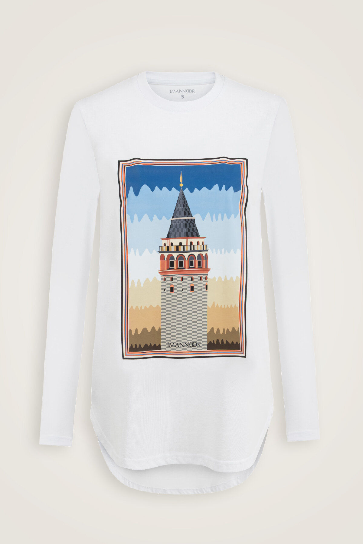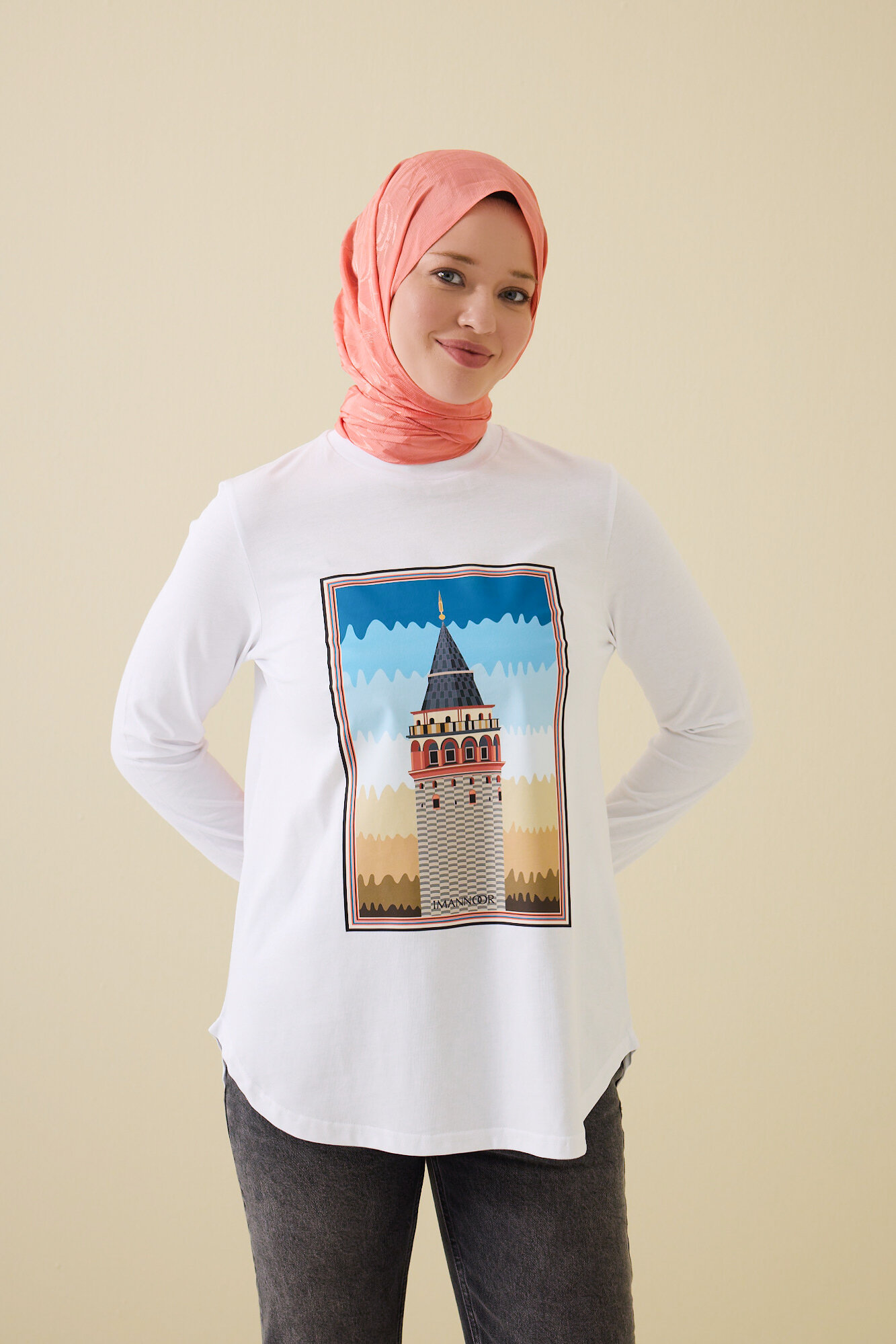 İmannoor’un şehir silüetlerini sanatsal bir yorumla buluşturduğu Galata Uzun Kollu Beyaz Tişört, İstanbul’un simgelerinden biri olan Galata Kulesi’ni modern bir sadelikle üzerinizde taşır. Zarif çizgilerle işlenen Galata motifi; geçmişle bugünü, tarih ile gündelik yaşamı şiirsel bir dengede birleştirir. %100 pamuk kumaşı sayesinde cilde dost, nefes alabilen ve konforlu bir yapı sunar. Hem şehirli hem de zamansız bir stilin parçasıdır.