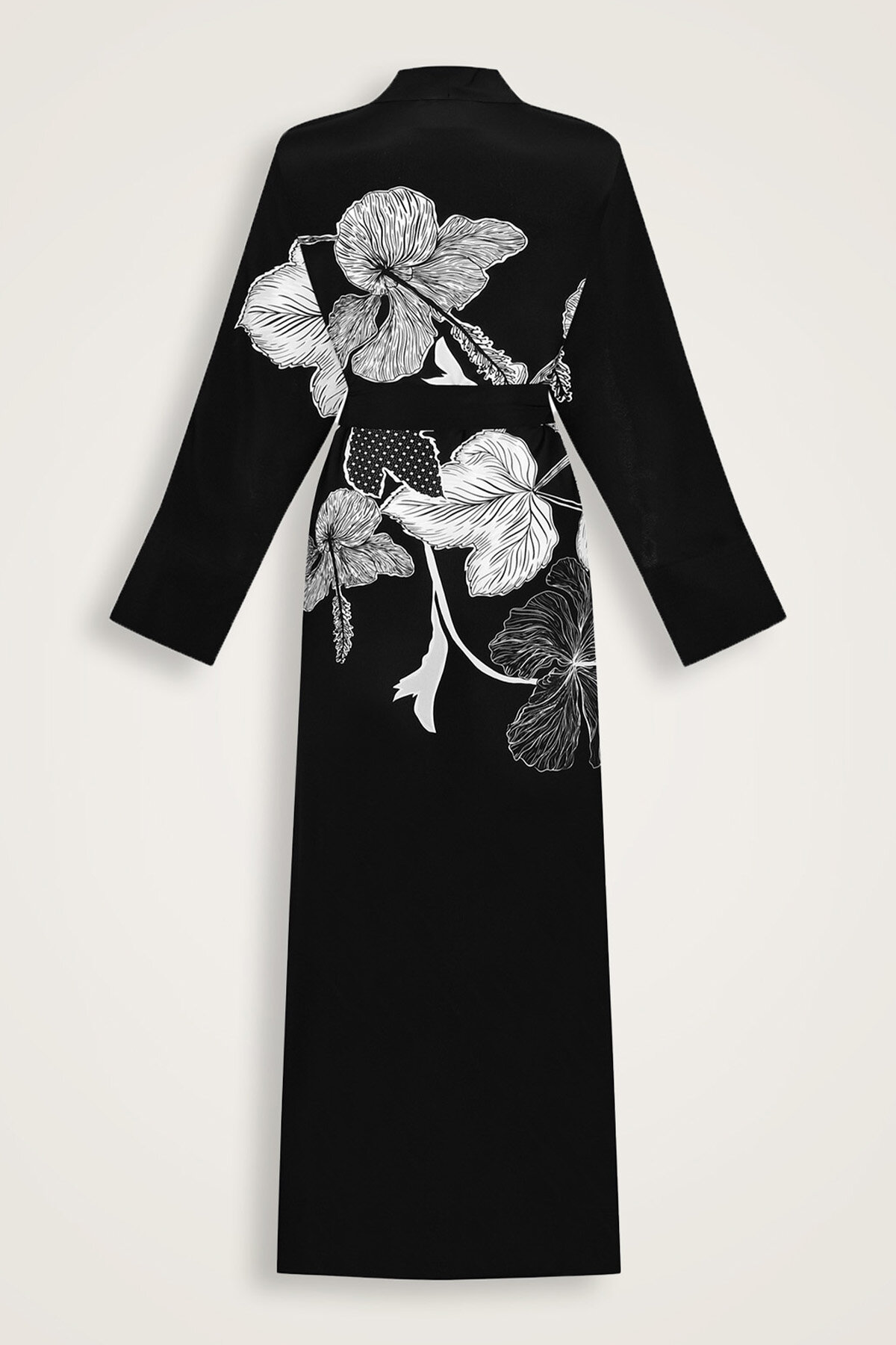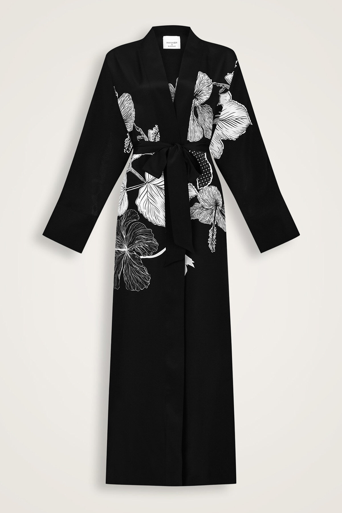 Doğanın zarafeti ve lüksün mükemmel birleşimi: İmannoor x Rawdah Mekke Gülü Krep İpek Kimono. %100 krep ipek kumaşı, şıklığınızı ve rahatlığınızı ön plana çıkarırken, Mekke gülü deseninin sofistike dokunuşu, kimono tasarımına zarif bir estetik katıyor.