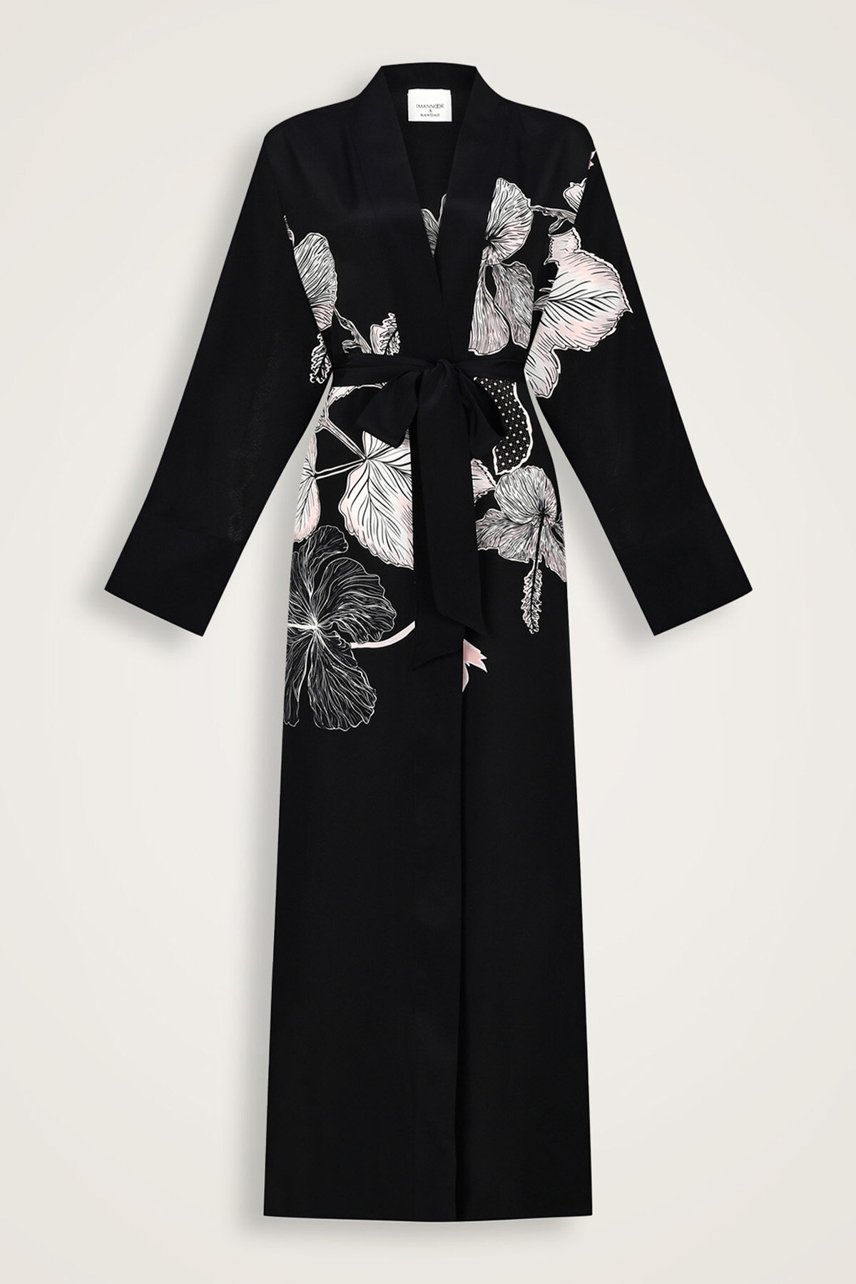 Doğanın zarafeti ve lüksün mükemmel birleşimi: İmannoor x Rawdah Mekke Gülü Krep İpek Kimono. %100 krep ipek kumaşı, şıklığınızı ve rahatlığınızı ön plana çıkarırken, Mekke gülü deseninin sofistike dokunuşu, kimono tasarımına zarif bir estetik katıyor.