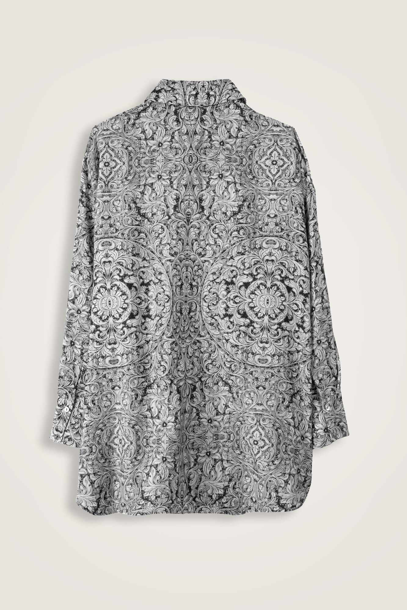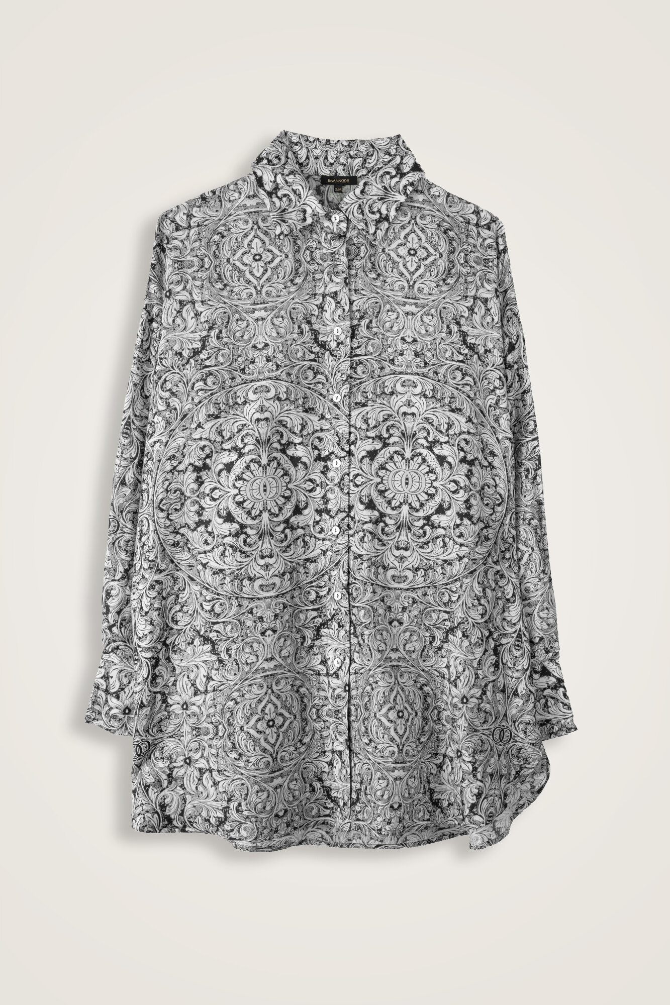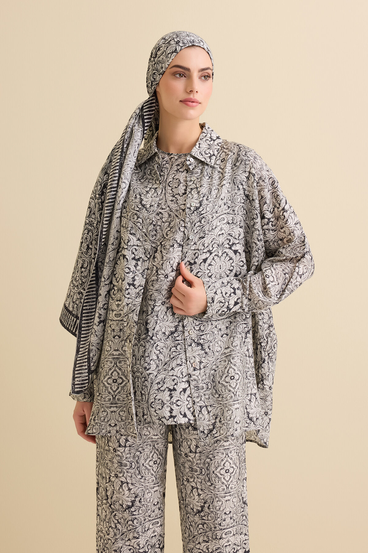 Kapı Desen Pamuk İpek Gömlek, şıklığı doğal dokularla bir araya getirerek zamansız bir parça sunuyor.