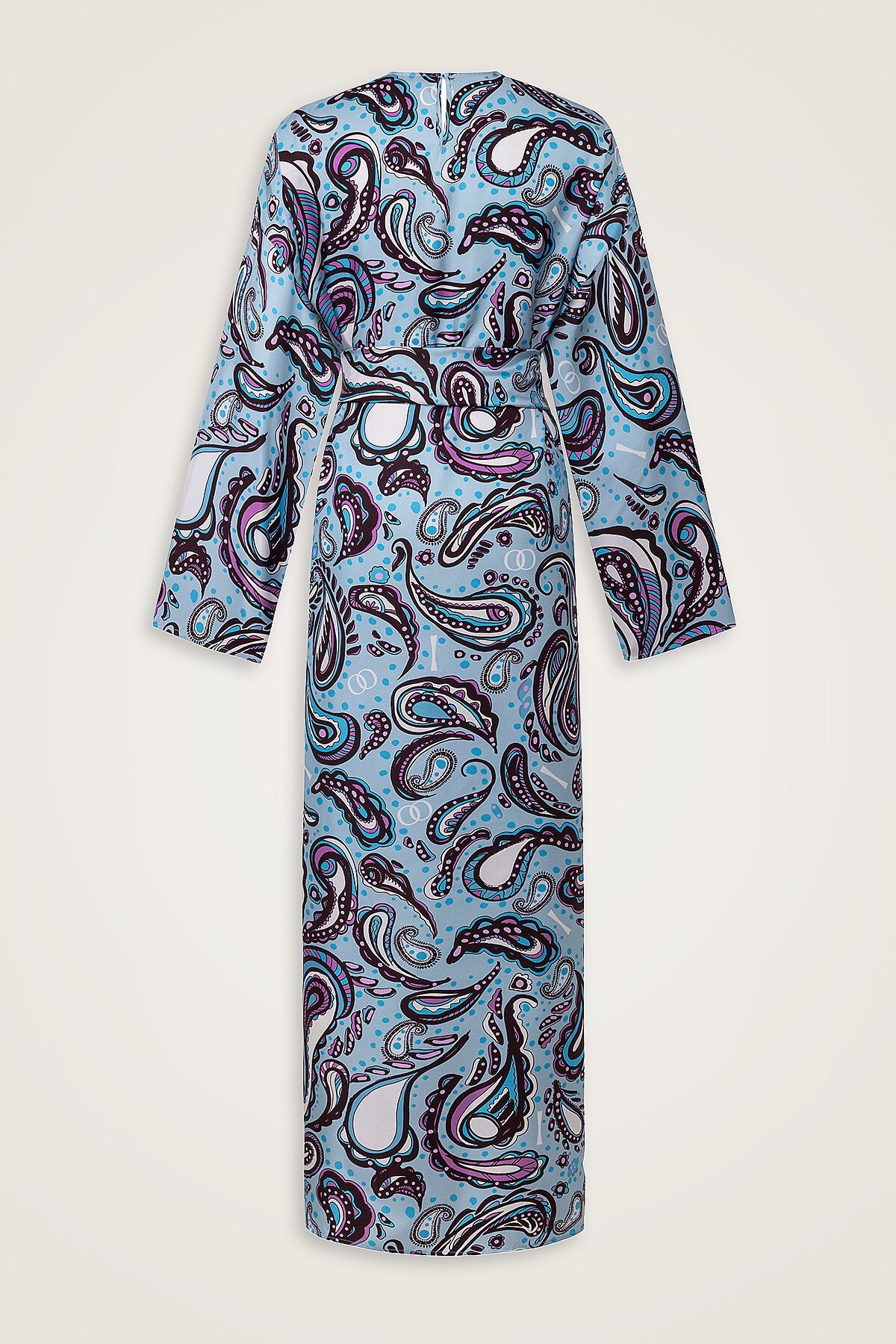 Keşmir Desen İpek Elbise ile ipeğin lüksünü, desenin gücünü ve İmannoor’un zarif dokunuşunu bir arada hissedin.