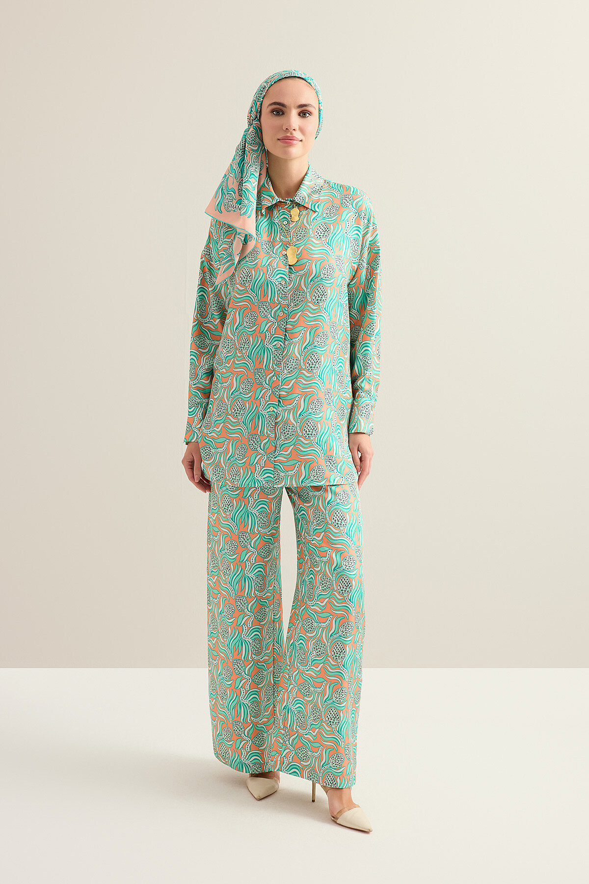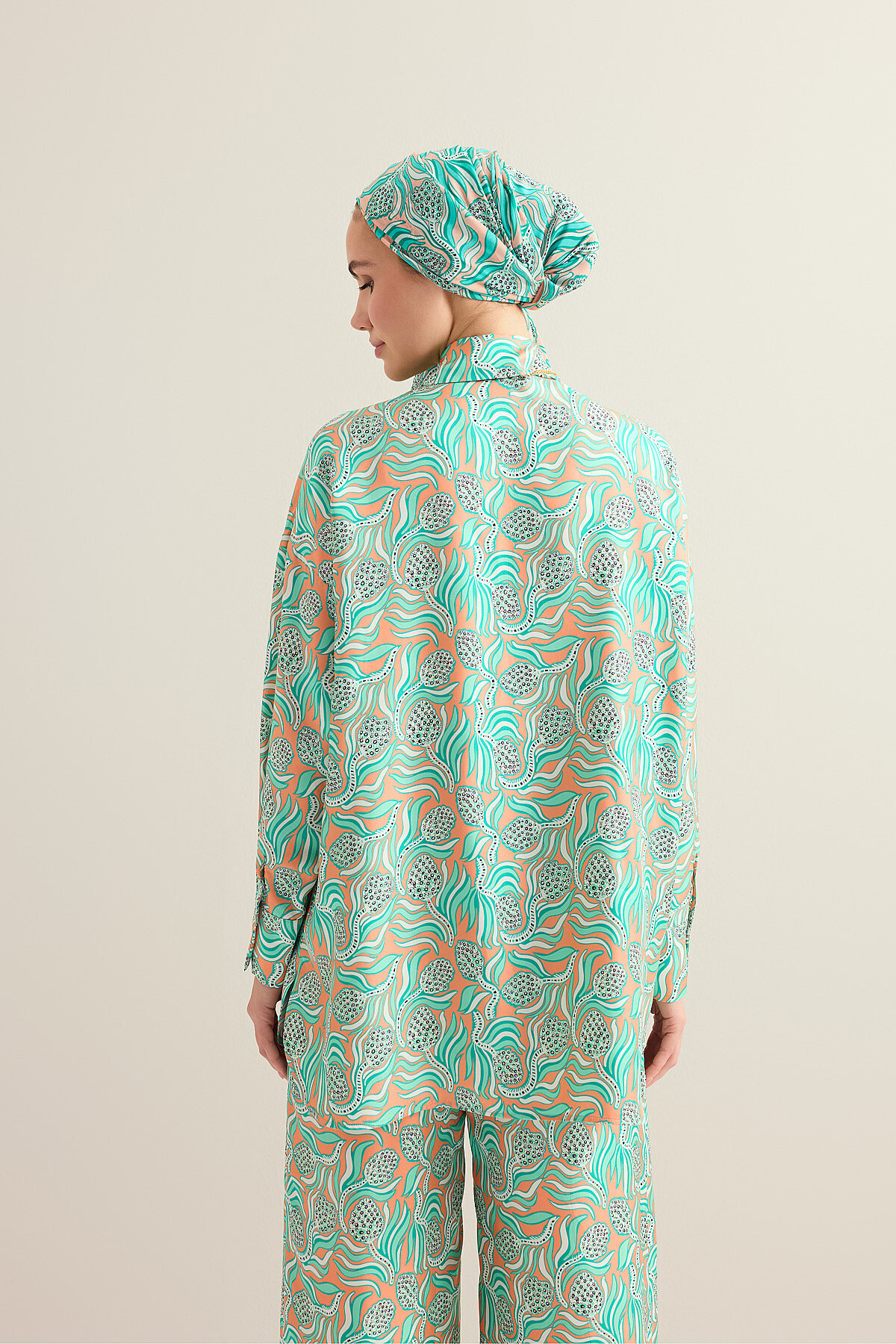 Kozalak Çiçeği Somon-Turkuaz Tivil İpek Gömlek