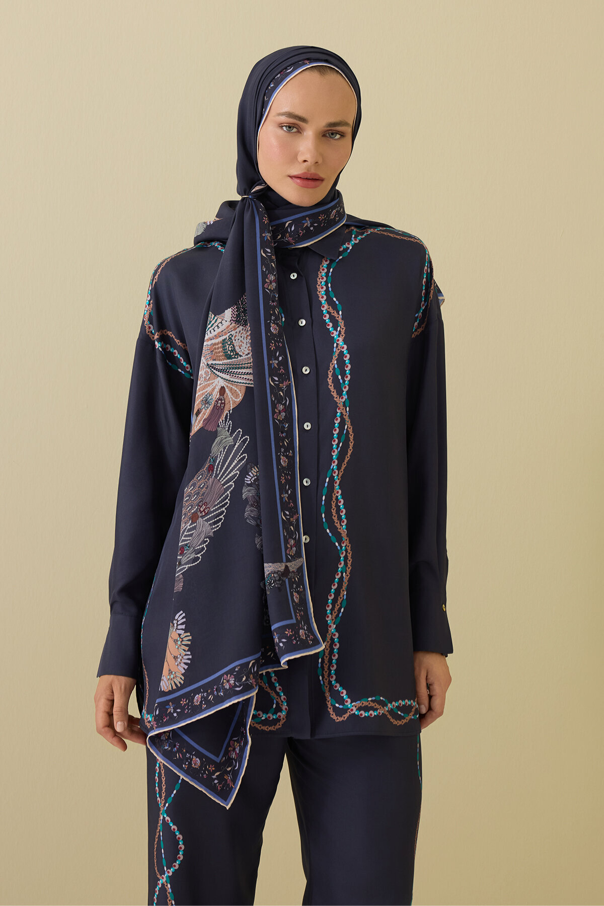 Kuşlu Noor Krep İpek Gömlek Şalı ile stilinize zarif bir özgürlük dokunuşu ekleyin.