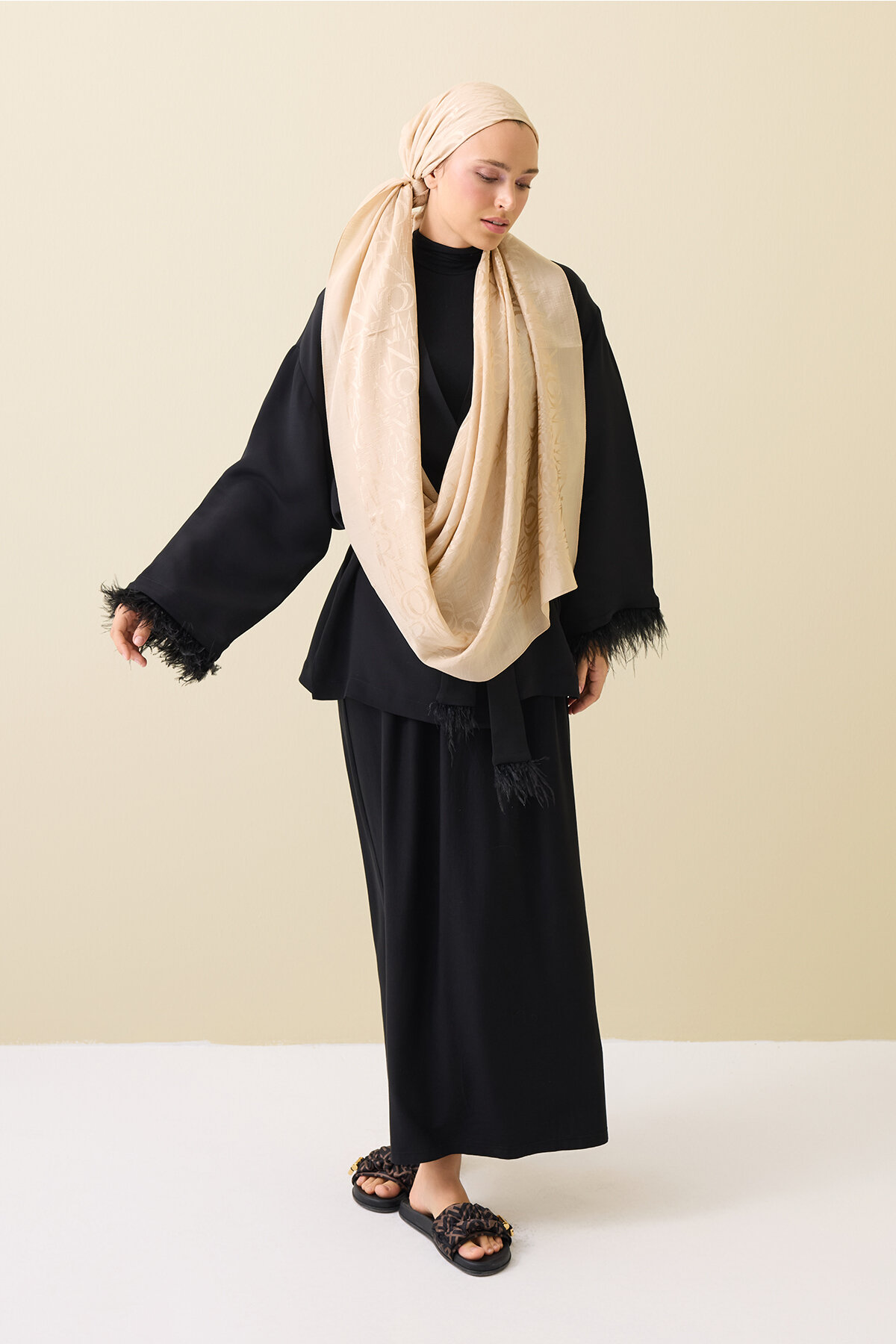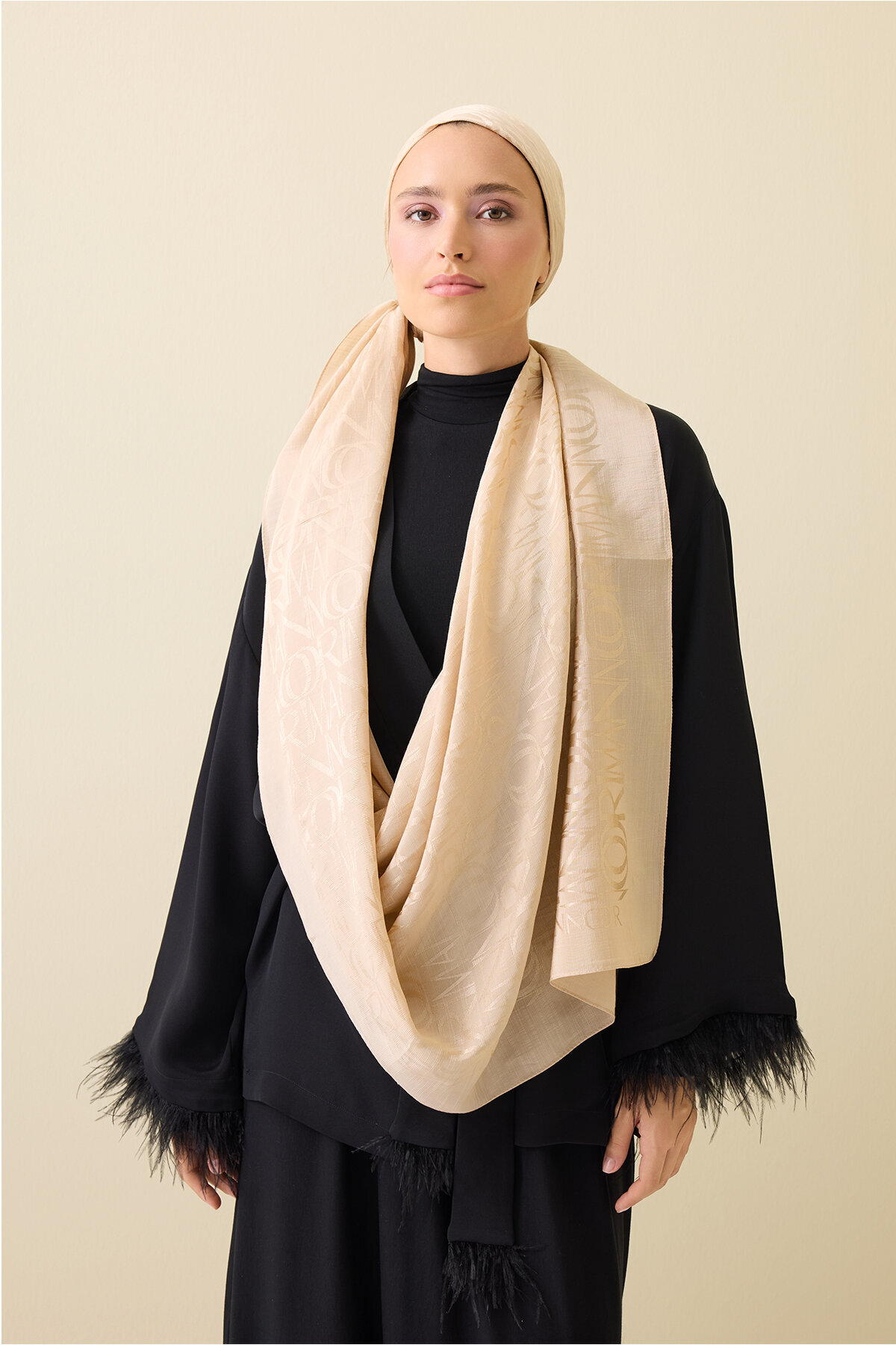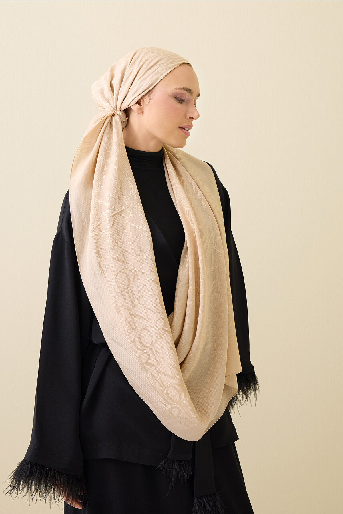 İmannoor’un özgün İmza Monogram desenleriyle tasarlanan İmza Monogram Shiny Jakar Şal, %67 floş ve %33 pamuk içeriğiyle hafif parlak yapısını doğal bir yumuşaklıkla buluşturuyor. 70x200 cm ölçüsü, farklı bağlama stillerine olanak tanırken; jakar dokuması sayesinde lüks bir görünüm sunuyor. Gündelik kombinlerinize zarif bir dokunuş katarken, özel davetlerde de sofistike bir tamamlayıcı olarak öne çıkar.