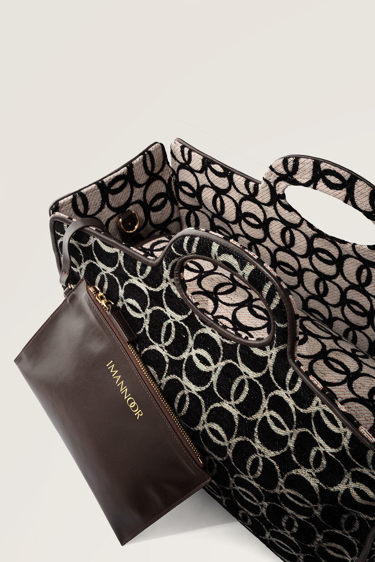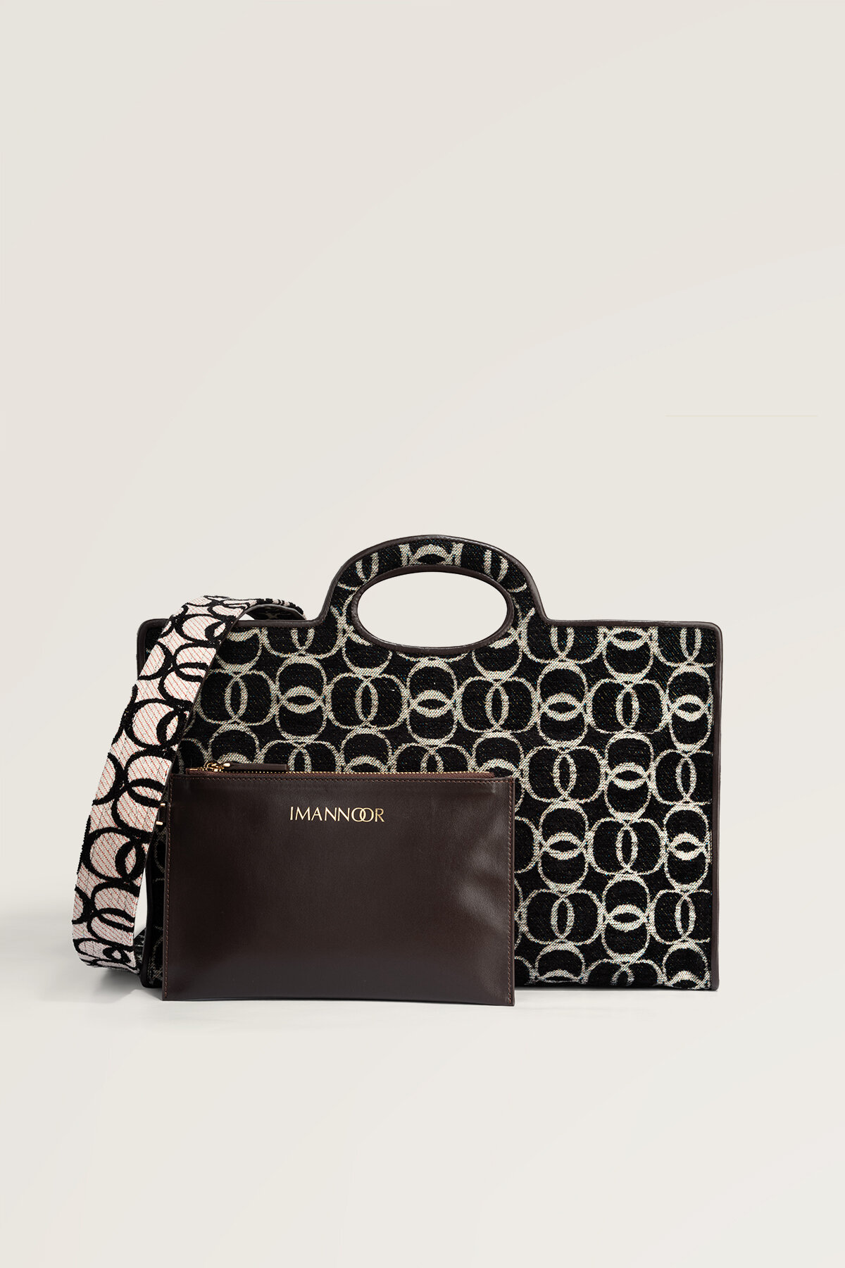 İmannoor’un karakteristik desen dilini yansıtan Monogram Dokuma Çanta, dokuma kumaşın dayanıklı ve tok yapısıyla hem şık hem de fonksiyonel bir kullanım sunar; monogram desenli özel dokuması çantaya sofistike ve güçlü bir kimlik kazandırırken, geniş iç hacmi günlük kullanımda pratiklik sağlar, zamansız tasarımı sayesinde hem günlük kombinlerde hem de şehir stilinde kolayca uyum sağlayan, stilinizi tamamlayan seçkin bir aksesuar olarak öne çıkar.