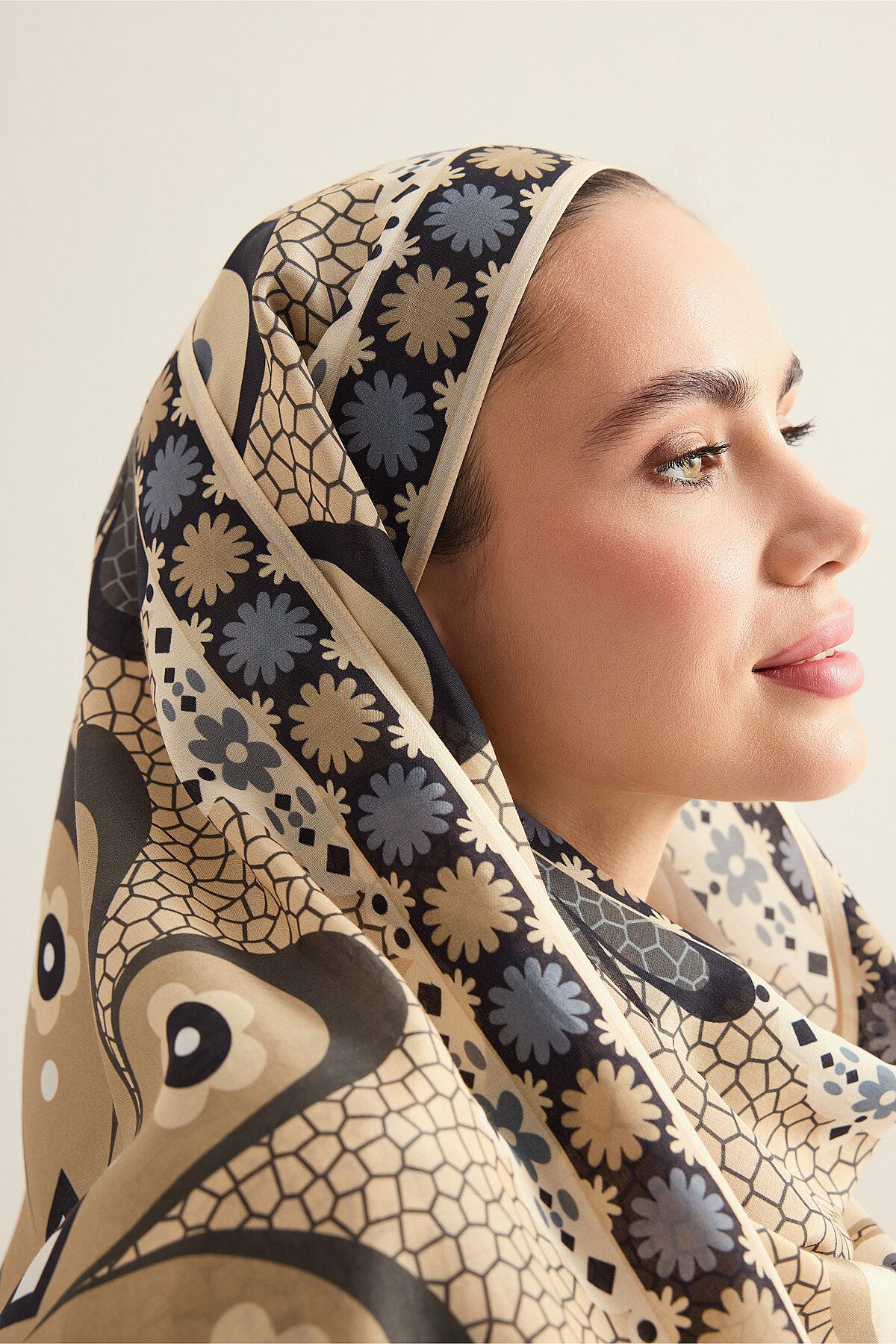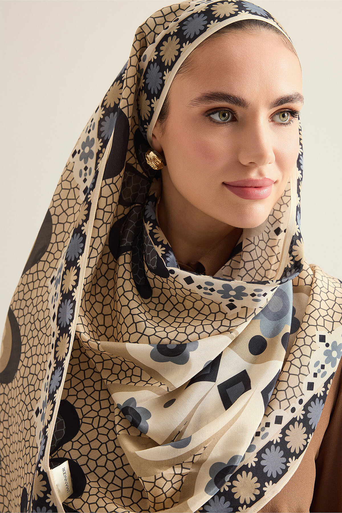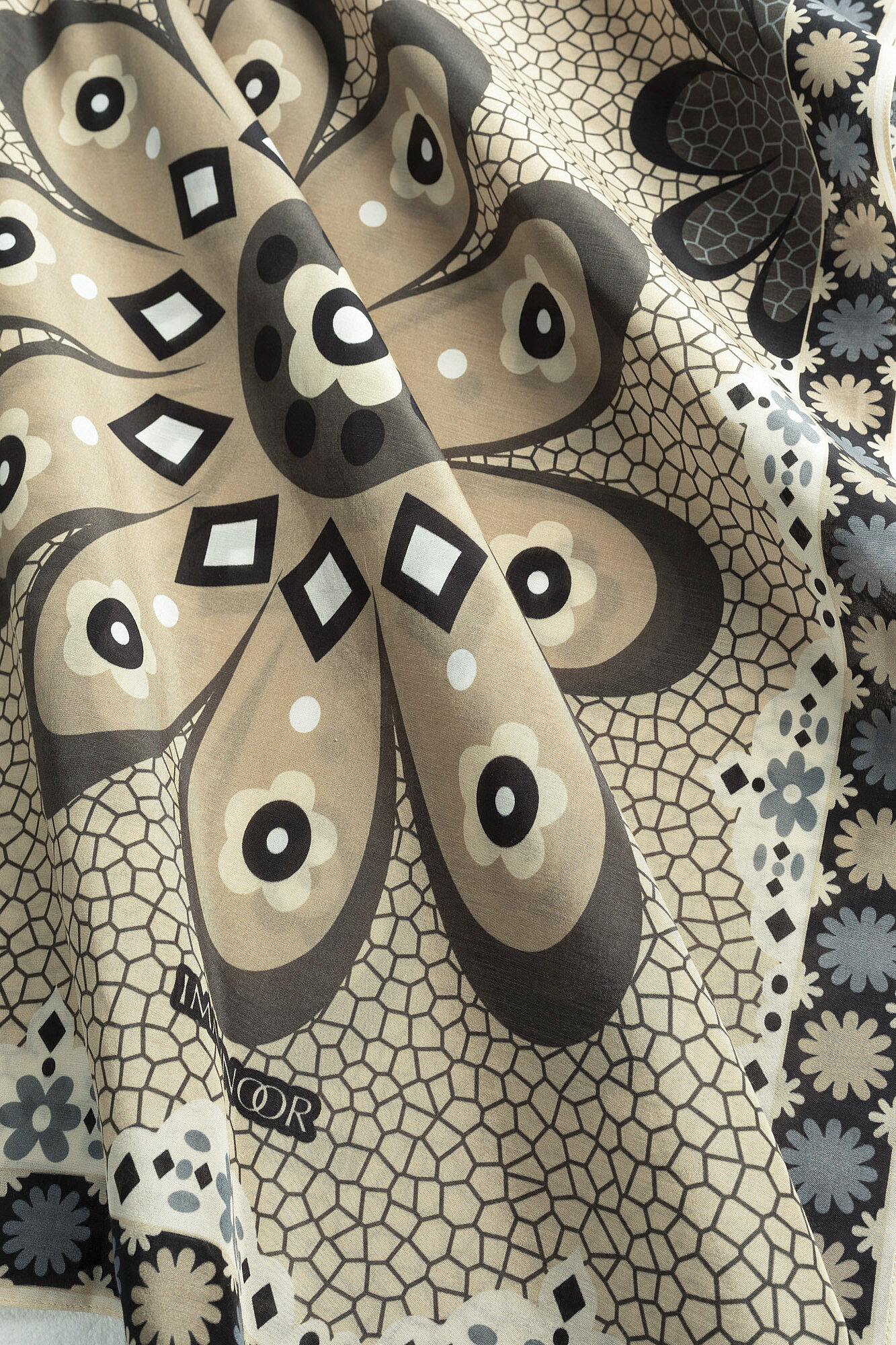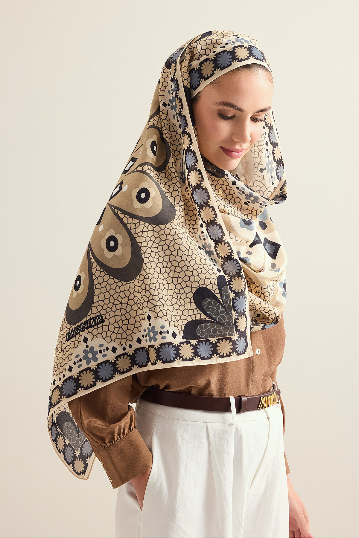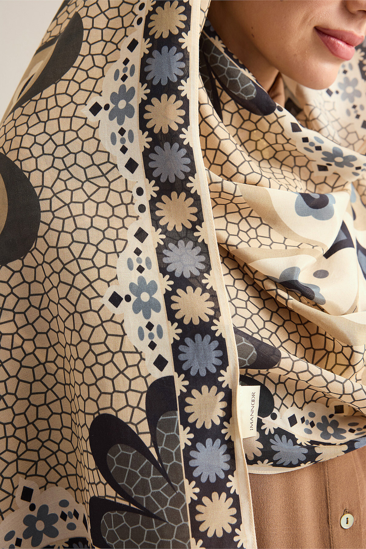 İmannoor’un doğadan ilham alan zarif tasarım anlayışını yansıtan Mozaik Papatya Pamuk Floş Şal, %52 pamuk ve %48 floş karışımıyla yumuşak, hafif ve nefes alabilen bir kullanım sunar; 70×210 cm ölçüsü sayesinde farklı bağlama ve kullanım alternatiflerine uyum sağlarken, mozaik dokulu papatya desenli özel tasarımıyla stile ferah ve feminen bir karakter kazandırır, pamuk konforunu floşun akışkan ve pürüzsüz dokusuyla birleştiren bu şal, hem günlük hem de şık kombinleri tamamlayan zamansız ve zarif bir aksesuar olarak öne çıkar.