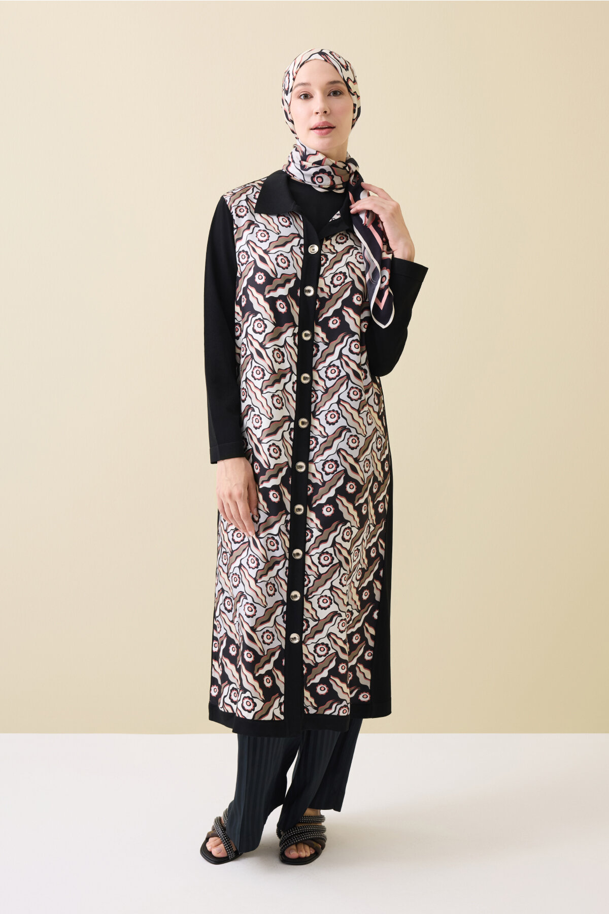 Gömlek yaka detayı ve zarif düğme kapanışı, tasarıma hem modern hem de klasik bir hava katar. Günlük kombinlerden özel davetlere kadar her ortamda kolayca uyum sağlayan zamansız bir parçadır.