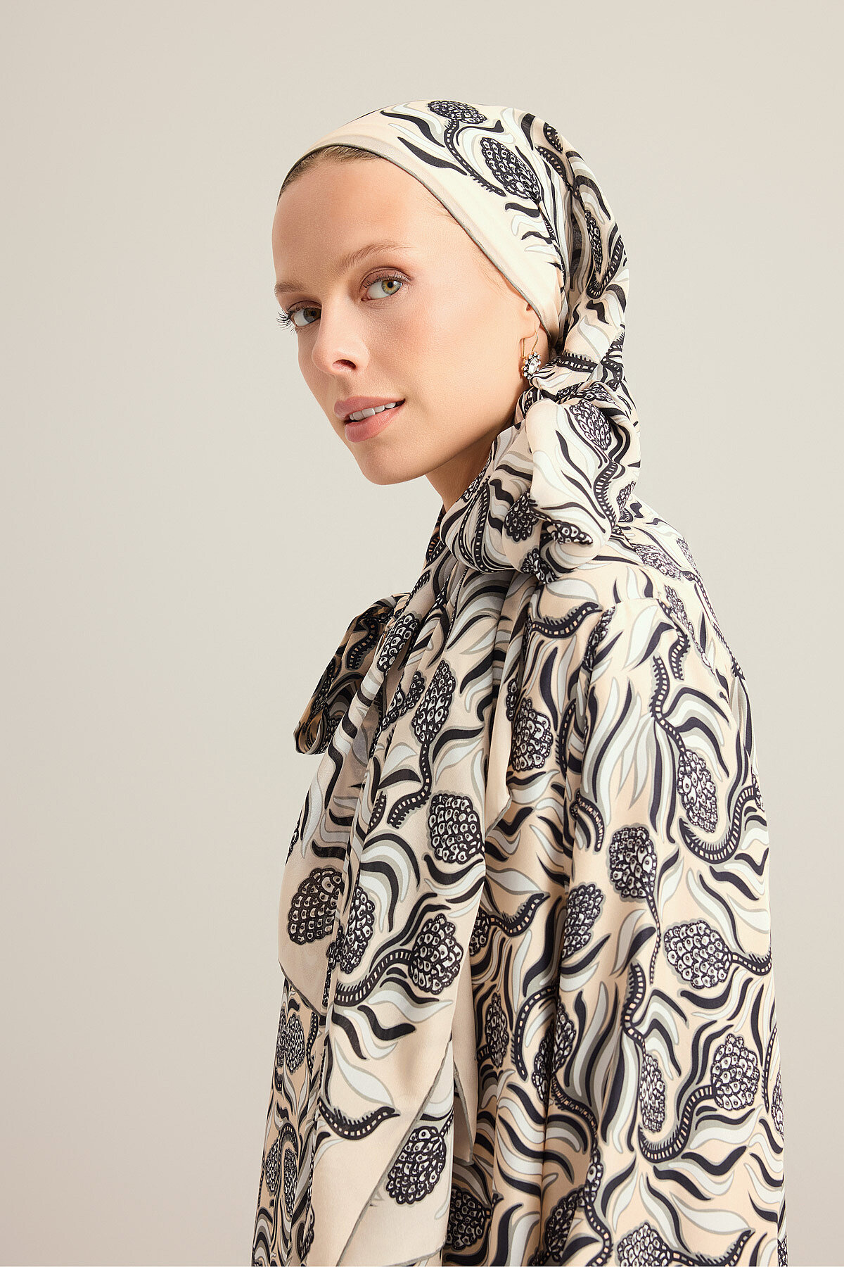 İmannoor’un doğadan ilham alan zarif tasarım anlayışını yansıtan %100 ipek Kozalak Çiçeği Krep İpek Şal, krep ipeğin hafif ve yumuşak dokusu sayesinde akışkan ve konforlu bir kullanım sunar; 70×210 cm ölçüsüyle farklı bağlama ve kullanım alternatifleri sağlayarak günlük ve özel kombinlere uyum sağlar, kozalak çiçeği desenli özel tasarımıyla stile doğal bir derinlik ve sofistike bir karakter kazandırırken, ipeğin doğal parlaklığı ve nefes alabilen yapısı gün boyu zarafet ve rahatlığı bir arada sunan zamansız bir aksesuar olarak öne çıkar.