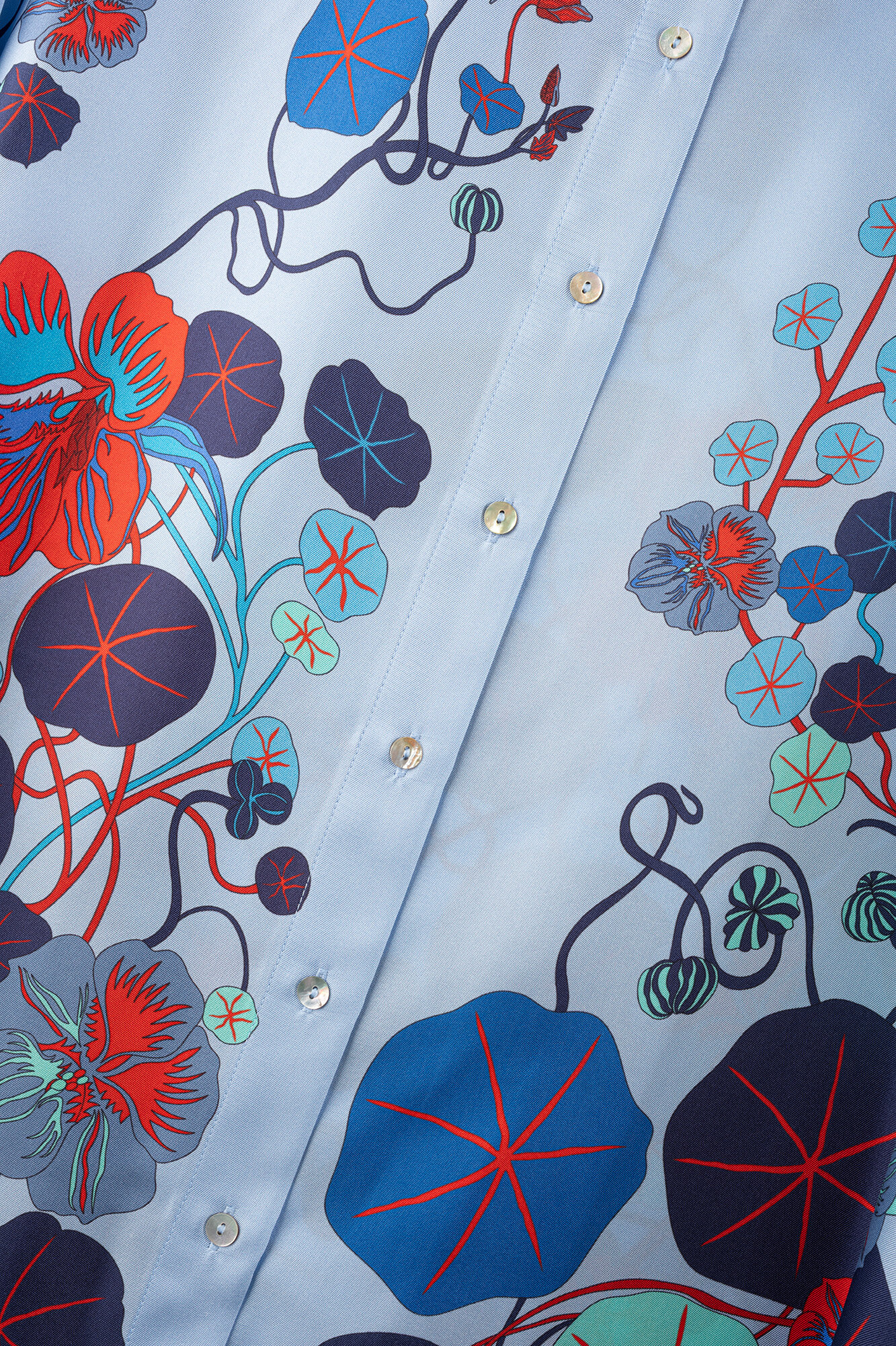 Havuz Çiçeği deseninin zarif ve akışkan dokusunu yansıtan bu tivil ipek gömlek, pürüzsüz yüzeyi ve hafif yapısıyla gün boyu konfor sunar. Tivil ipeğin doğal parlaklığı tasarıma sofistike bir ışıltı kazandırırken, dökümlü formu zarif ve dengeli bir siluet oluşturur. Hem klasik hem de modern kombinlerle uyum sağlayan bu model, zamansız ve rafine bir stilin güçlü tamamlayıcısıdır.