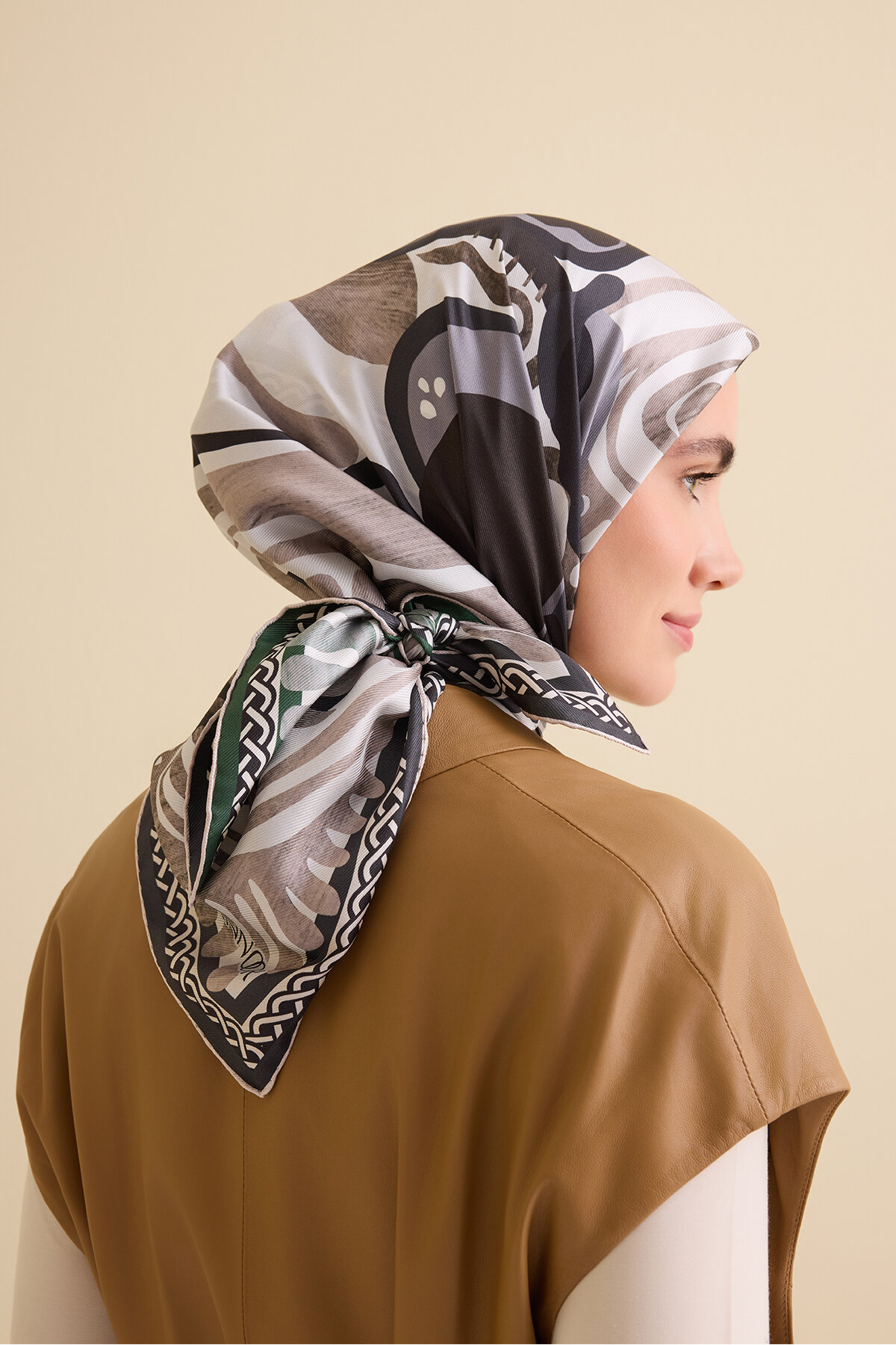 Çift taraflı tasarımı sayesinde farklı kombinlerde, tek parça ile iki ayrı görünüm elde edebilirsiniz. 94x94 cm ölçüsüyle boyun, baş, çanta ya da bilek aksesuarı olarak rahatlıkla kullanılabilir.