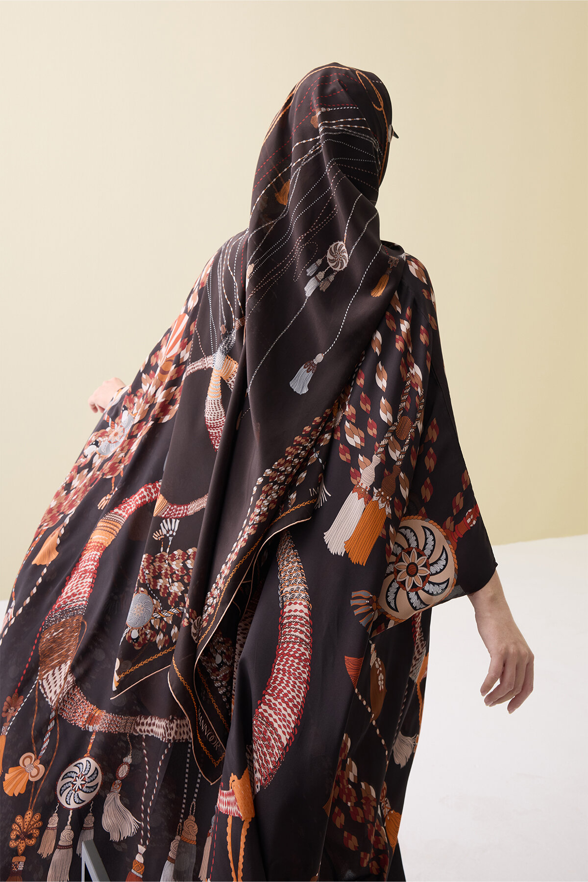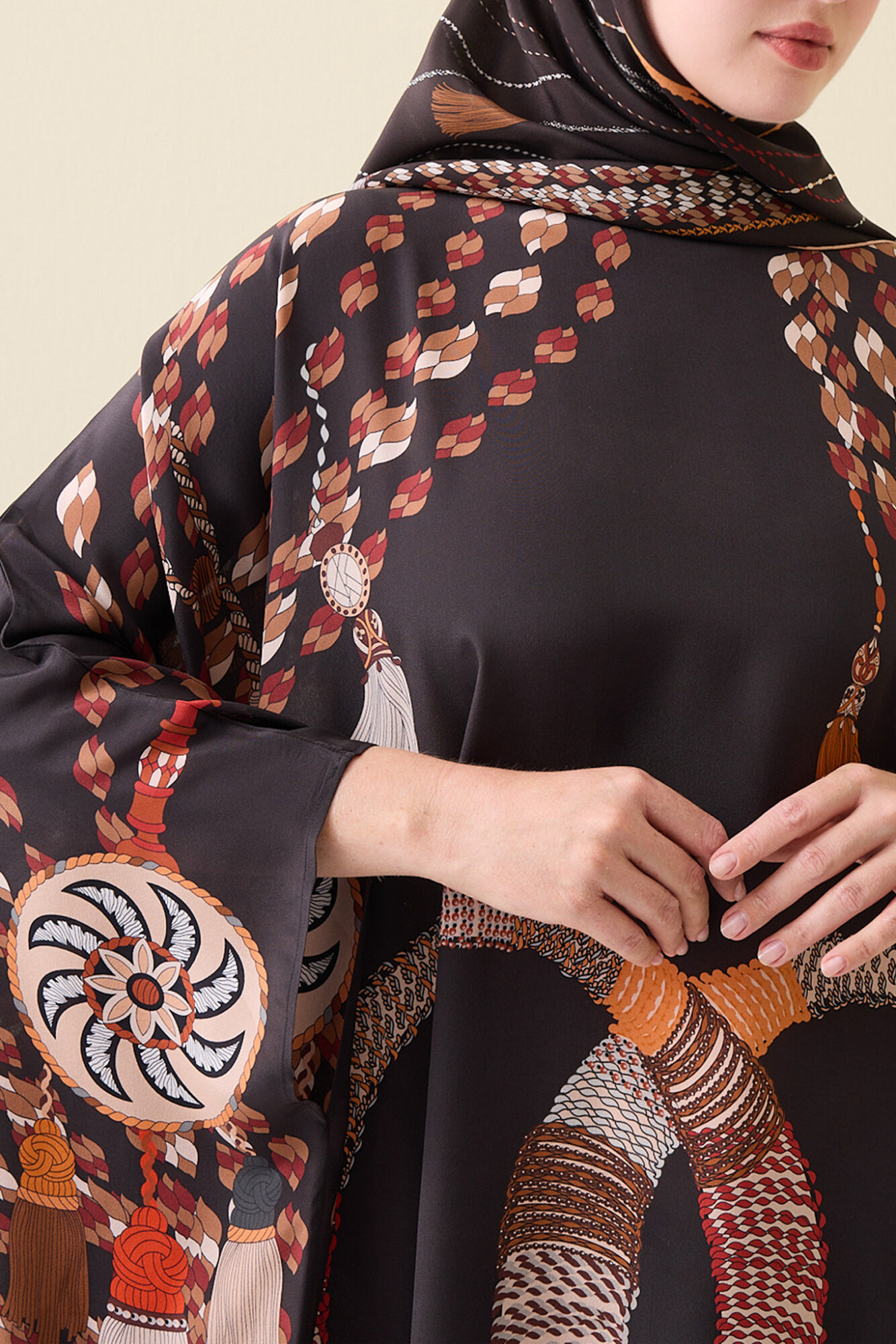 İmannoor’un özgün detaylarla bezeli tasarım anlayışını yansıtan Püskül Noor İpek Kaftan, %100 ipek kumaşıyla hafif, akışkan ve doğal parlaklığa sahip bir şıklık sunar. Uç kısımlarındaki zarif püskül detayları, tasarıma dinamizm katarken; sade kesimiyle dengeli ve modern bir siluet oluşturur.