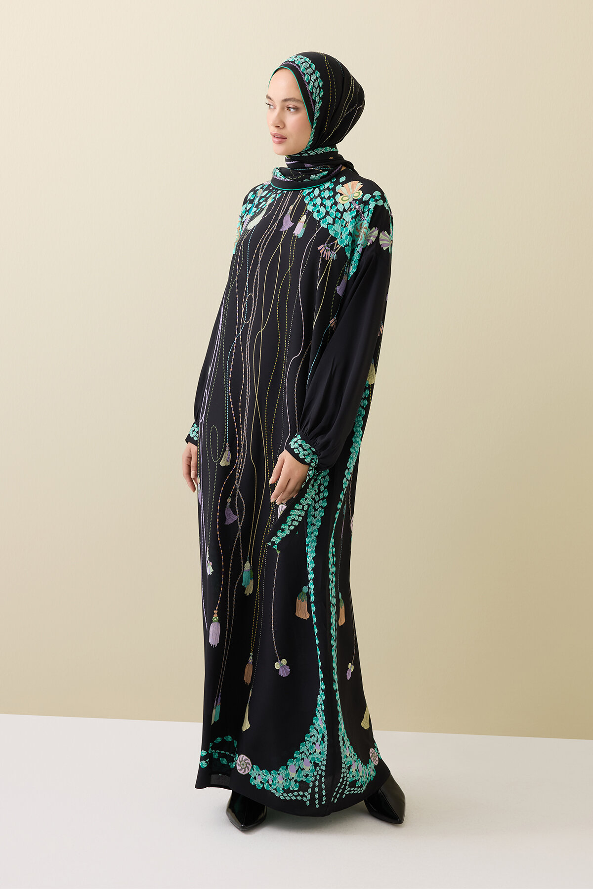 İmannoor’un zarif tasarım anlayışını yansıtan Püskül Noor İpek Elbise, %100 saf ipeğin lüks dokusu ve doğal ışıltısı ile öne çıkar. Akışkan silueti, vücuda hafifçe oturarak rahat bir şıklık sunarken, püskül detayları elbiseye özgün ve hareketli bir karakter katar.