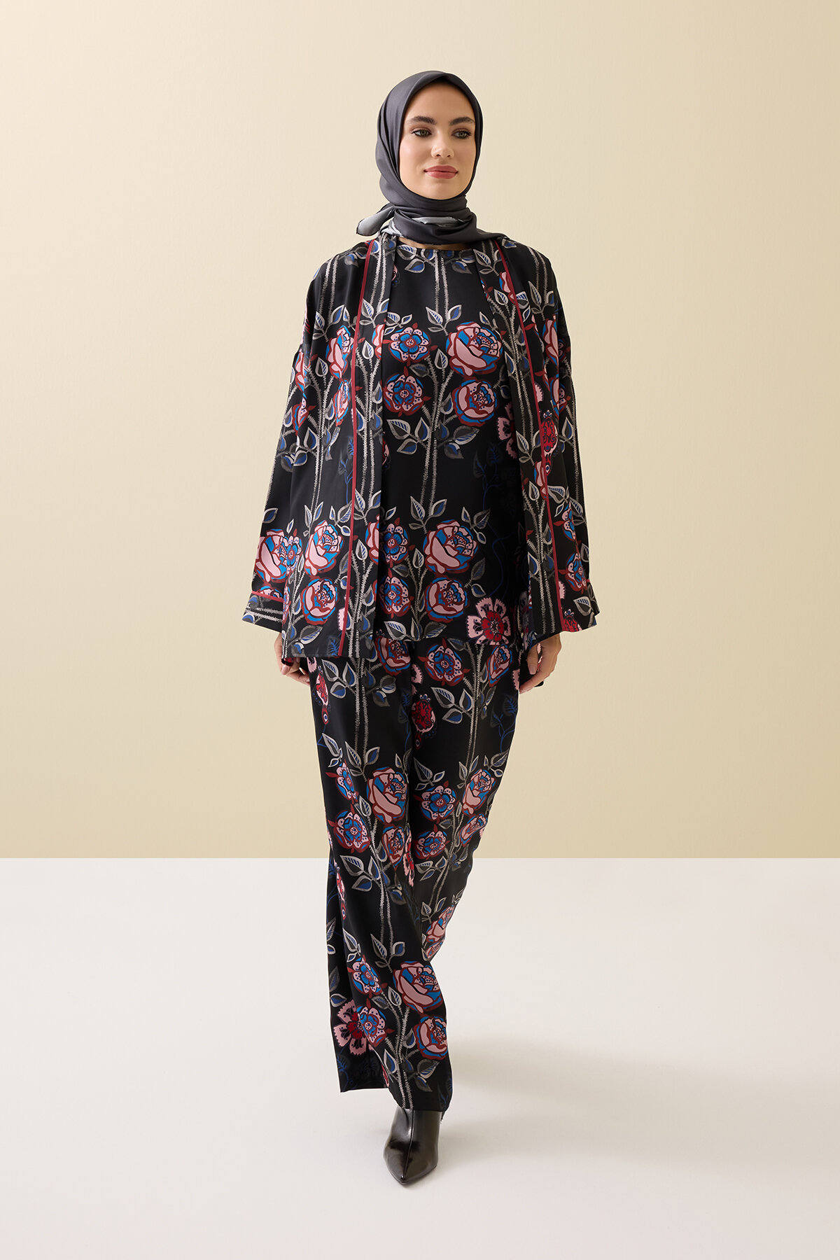 Gül Sarmaşık Siyah İpek Atlet, doğallıkla zarafeti birleştiren, sade ama etkileyici bir gardırop parçası.