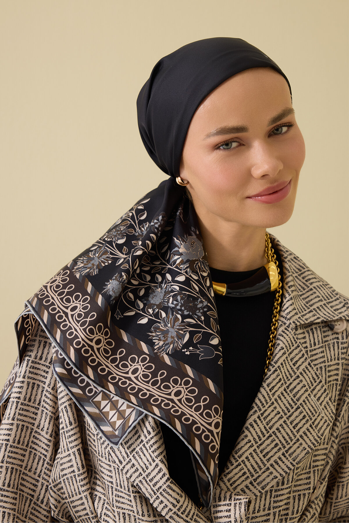 İmannoor’un klasik şıklığı doğanın en narin çiçeklerinden ilhamla buluşturduğu Şakayık Tivil İpek Eşarp, zarafeti ve feminen gücü simgeler. Şakayık desenlerinin incelikle işlendiği bu özel parça, yumuşak kahve tonlarıyla birleşerek sofistike bir görünüm sunar.