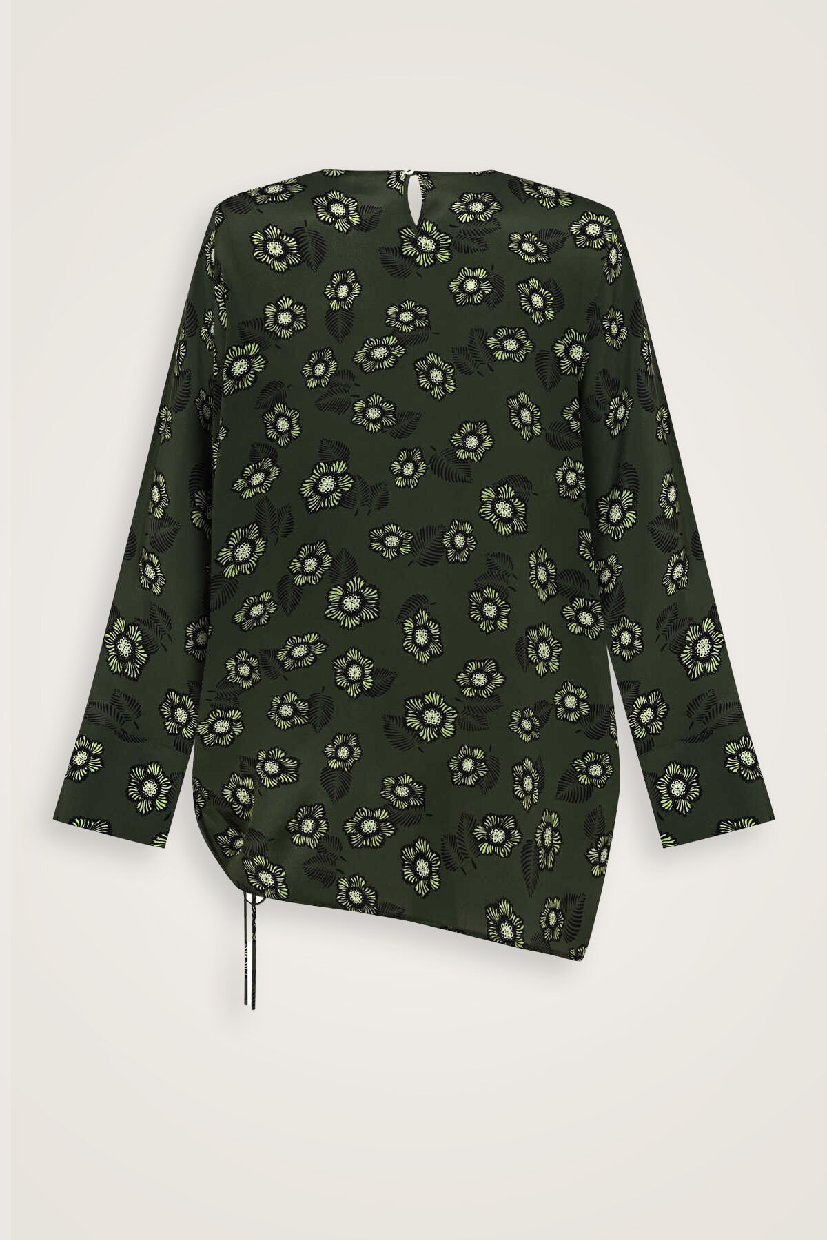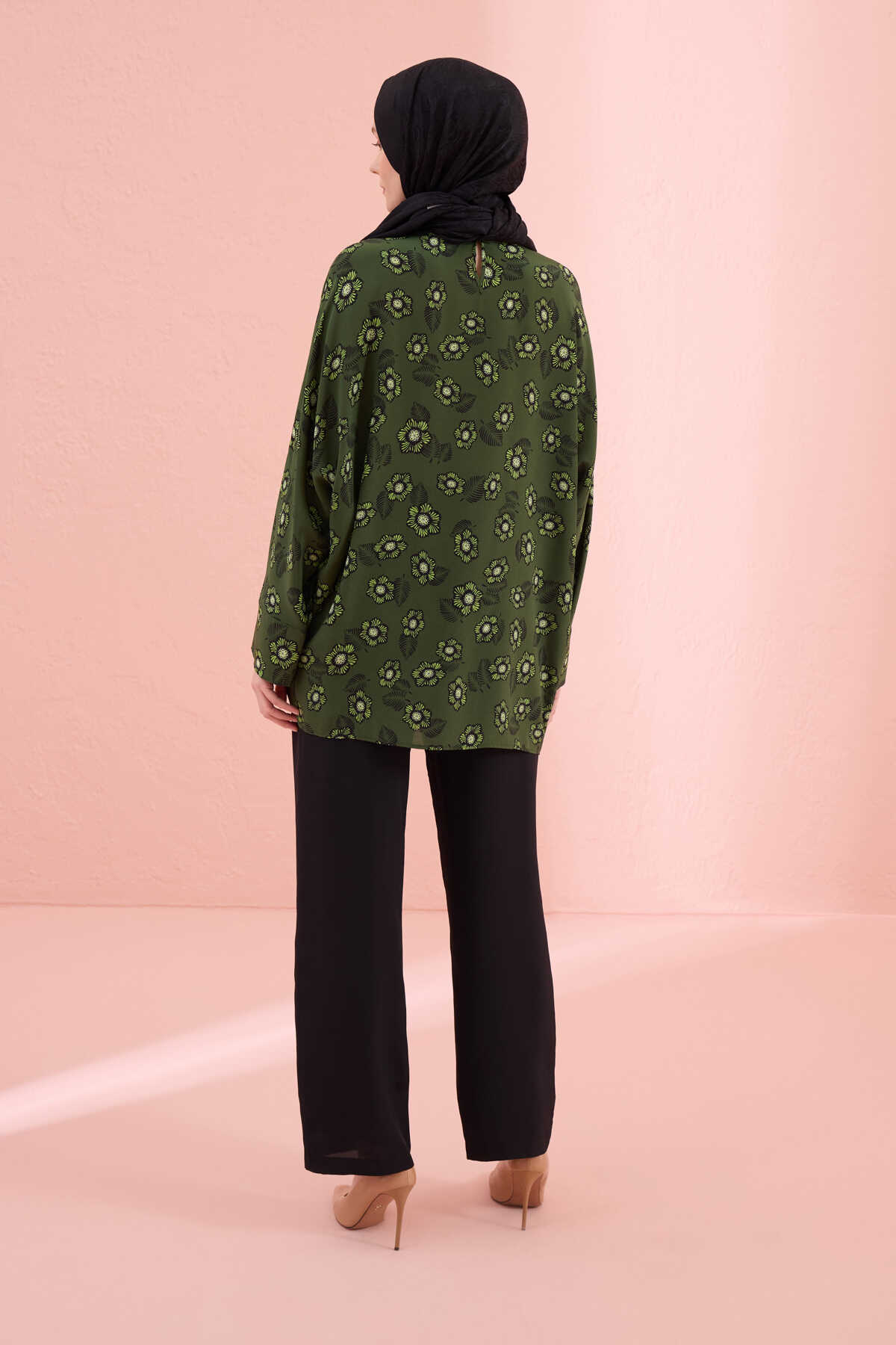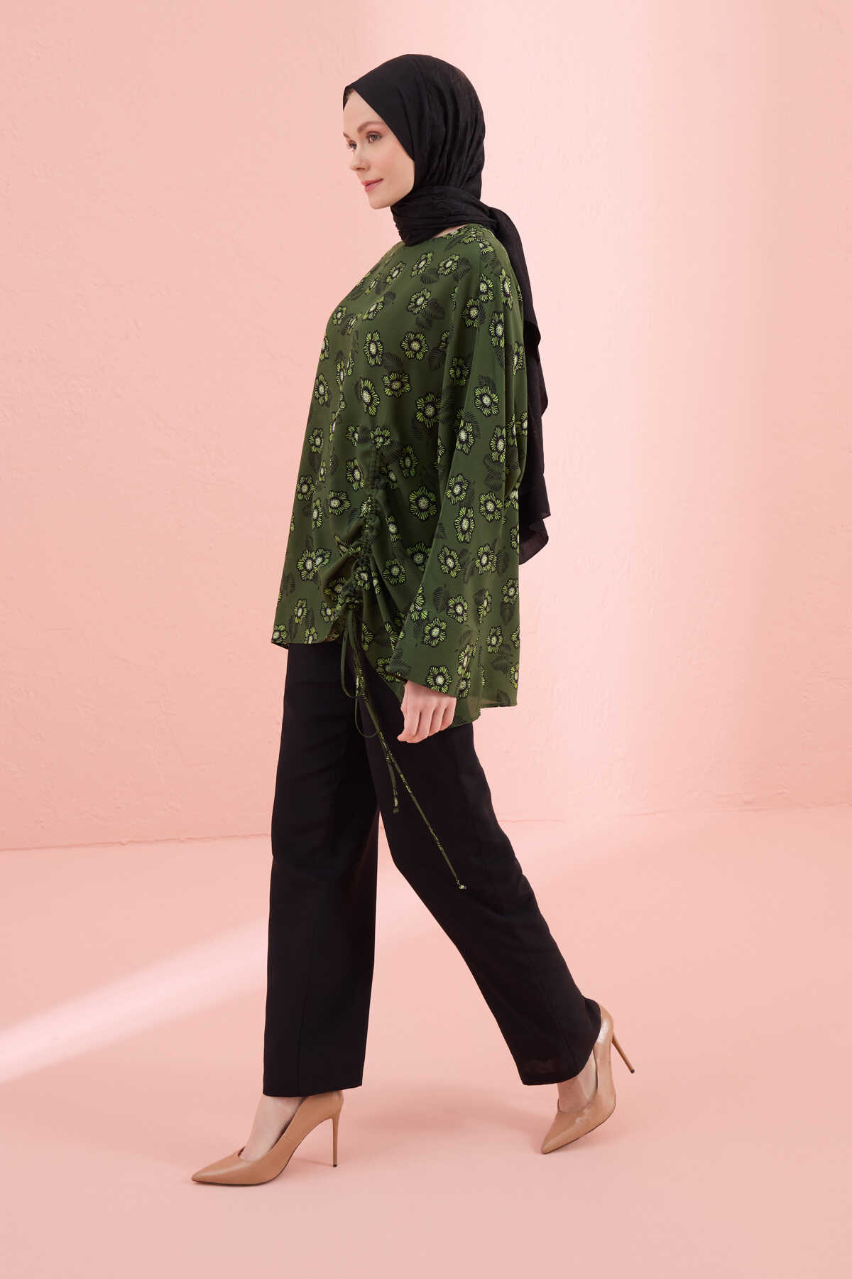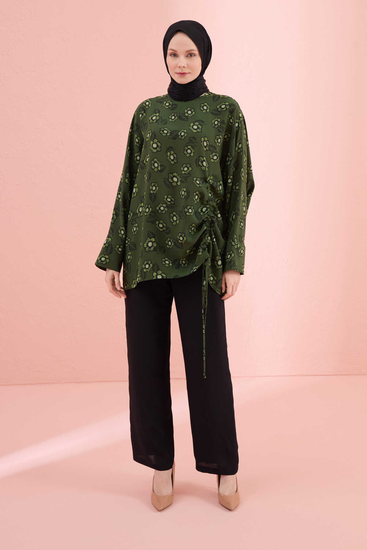 Serpme Çiçek Büzgülü İpek Bluz ile ipeğin zarafetini, doğadan ilham alan desenlerle buluşturun.
