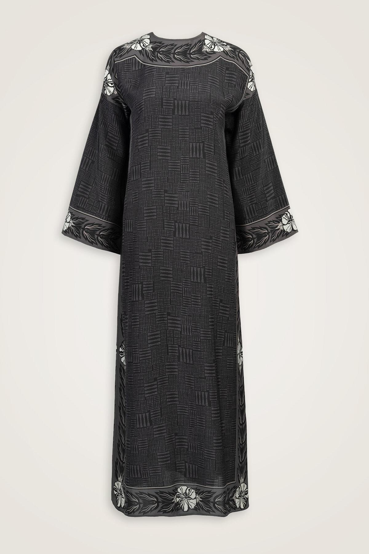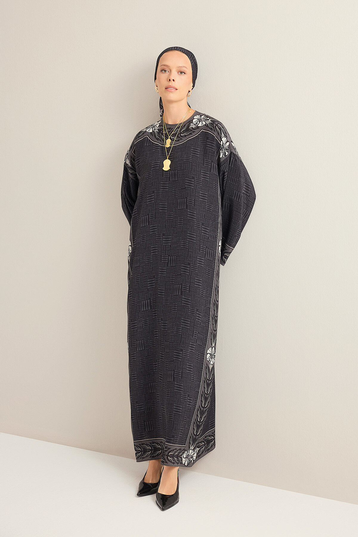 Taş Duvar deseninin özgün ve karakterli dokusunu zarif bir siluetle buluşturan bu krep ipek elbise, %100 ipek yapısıyla hafif, akıcı ve nefes alan bir kullanım sunar. Krep ipeğin doğal mat ışıltısı ve yumuşak dökümlü formu, elbiseye sofistike bir duruş kazandırırken gün boyu konfor sağlar. Hem günlük şıklıkta hem de özel anlarda zahmetsiz bir zarafet arayanlar için tasarlanan bu model, zamansız ve güçlü bir stil vurgusu taşır.