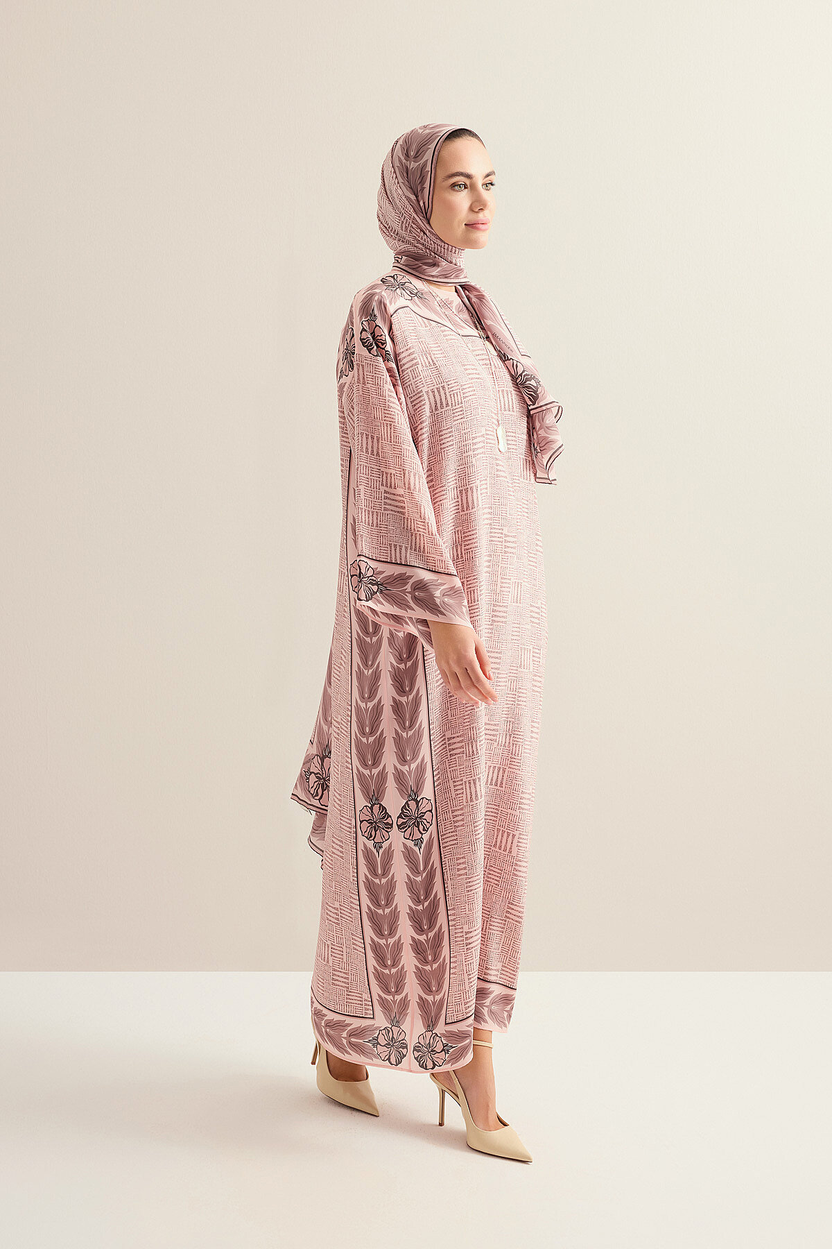 Taş Duvar deseninin özgün ve karakterli dokusunu zarif bir siluetle buluşturan bu krep ipek elbise, %100 ipek yapısıyla hafif, akıcı ve nefes alan bir kullanım sunar. Krep ipeğin doğal mat ışıltısı ve yumuşak dökümlü formu, elbiseye sofistike bir duruş kazandırırken gün boyu konfor sağlar. Hem günlük şıklıkta hem de özel anlarda zahmetsiz bir zarafet arayanlar için tasarlanan bu model, zamansız ve güçlü bir stil vurgusu taşır.