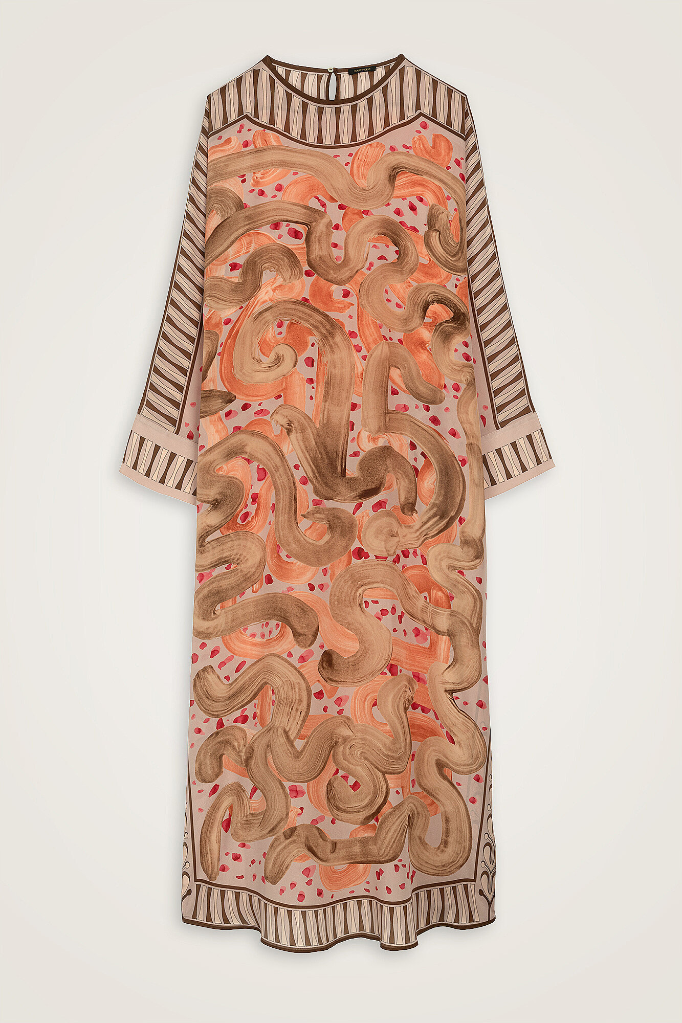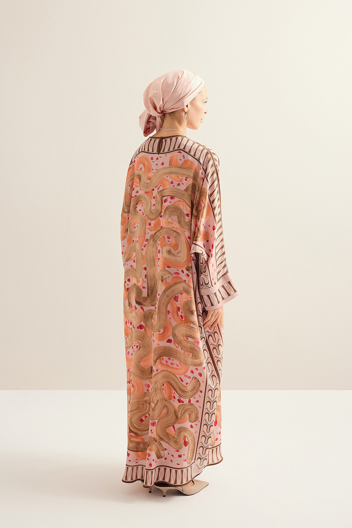 Dere Yolu deseninin akışkan ve zarif çizgilerini taşıyan bu krep ipek kaftan, pürüzsüz dokusu ve hafif yapısıyla konforlu bir kullanım sunar. Krep ipeğin doğal parlaklığı tasarıma sofistike bir ışıltı kazandırırken, dökümlü formu hareketli ve zarif bir siluet oluşturur. Hem günlük kombinlerde hem de özel anlarda şıklığı zahmetsizce tamamlayan bu kaftan, zamansız ve güçlü bir stil ifadesi sunar.