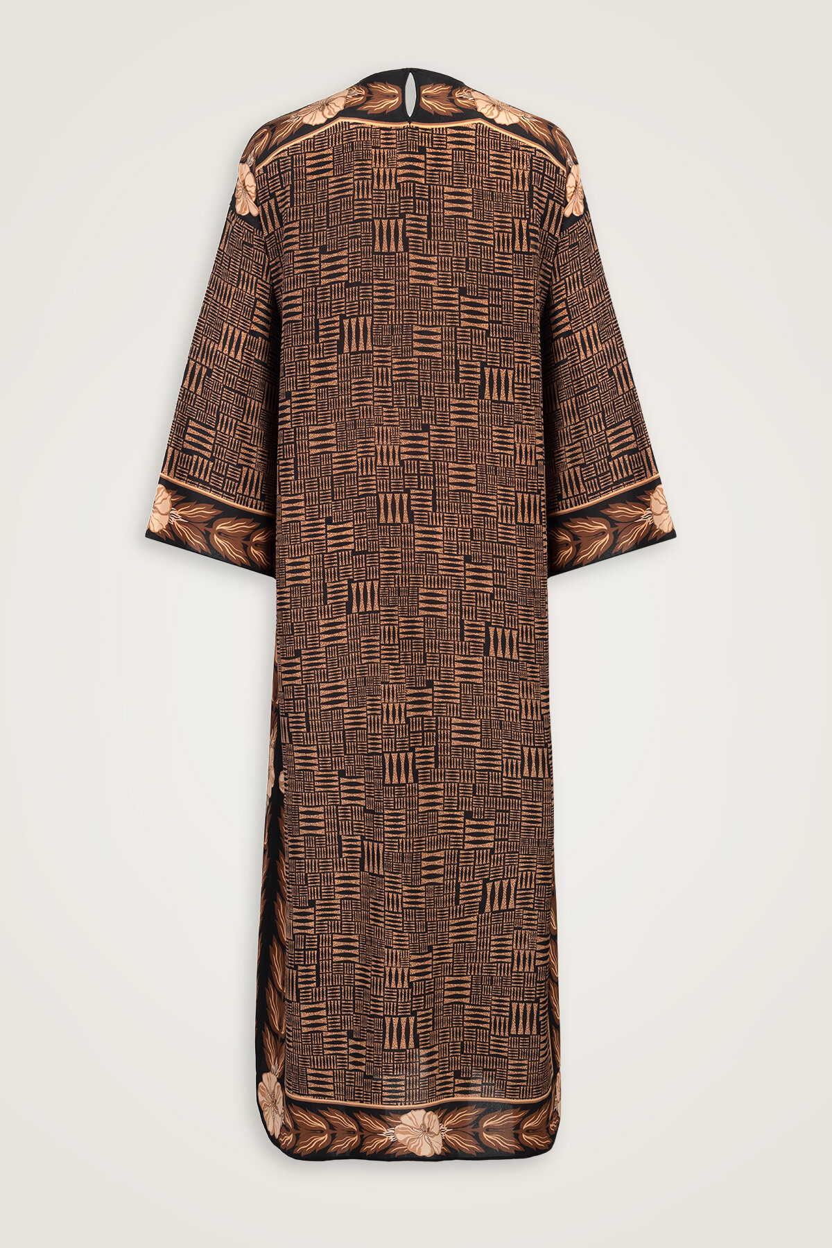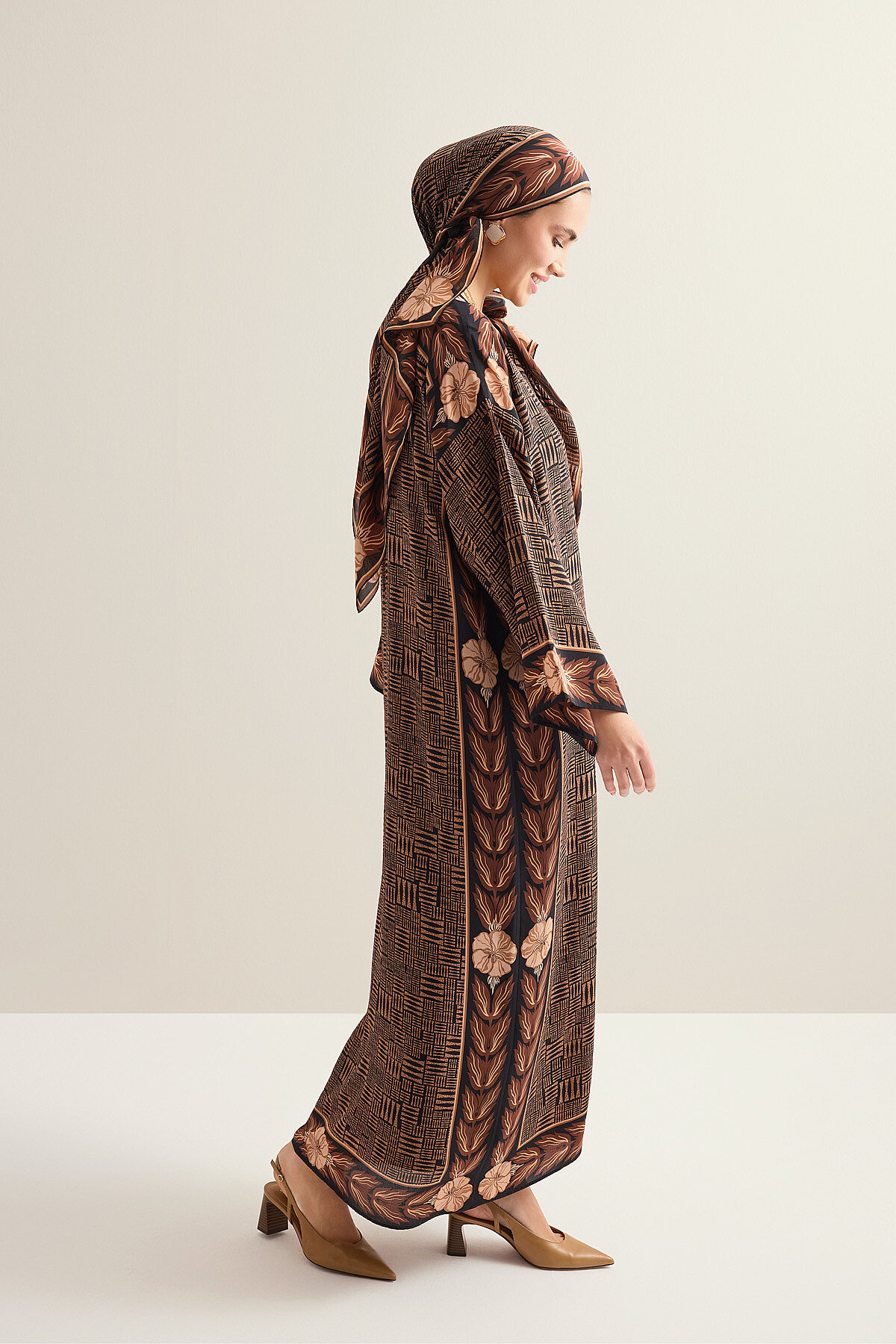 Taş Duvar deseninin özgün ve karakterli dokusunu zarif bir siluetle buluşturan bu krep ipek elbise, %100 ipek yapısıyla hafif, akıcı ve nefes alan bir kullanım sunar. Krep ipeğin doğal mat ışıltısı ve yumuşak dökümlü formu, elbiseye sofistike bir duruş kazandırırken gün boyu konfor sağlar. Hem günlük şıklıkta hem de özel anlarda zahmetsiz bir zarafet arayanlar için tasarlanan bu model, zamansız ve güçlü bir stil vurgusu taşır.