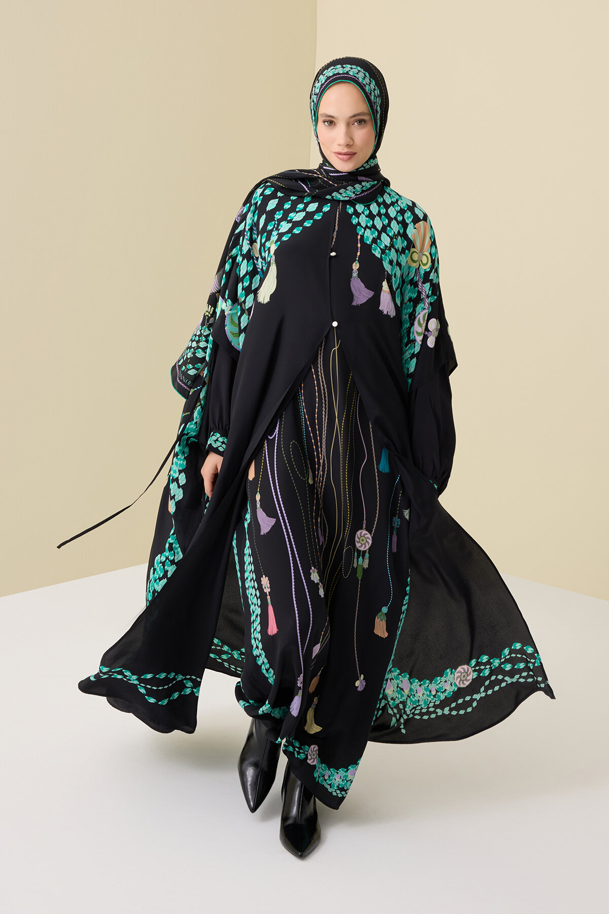 Zamansız şıklığı zarif detaylarla buluşturan Püskül Noor İpek Abaya, sade çizgileri ve akıcı formuyla modern bir duruş sergiliyor. %100 krep ipek kumaşıyla lüks dokunuşu hissettirirken, püskül detayları tasarıma sofistike bir hareket kazandırıyor.
