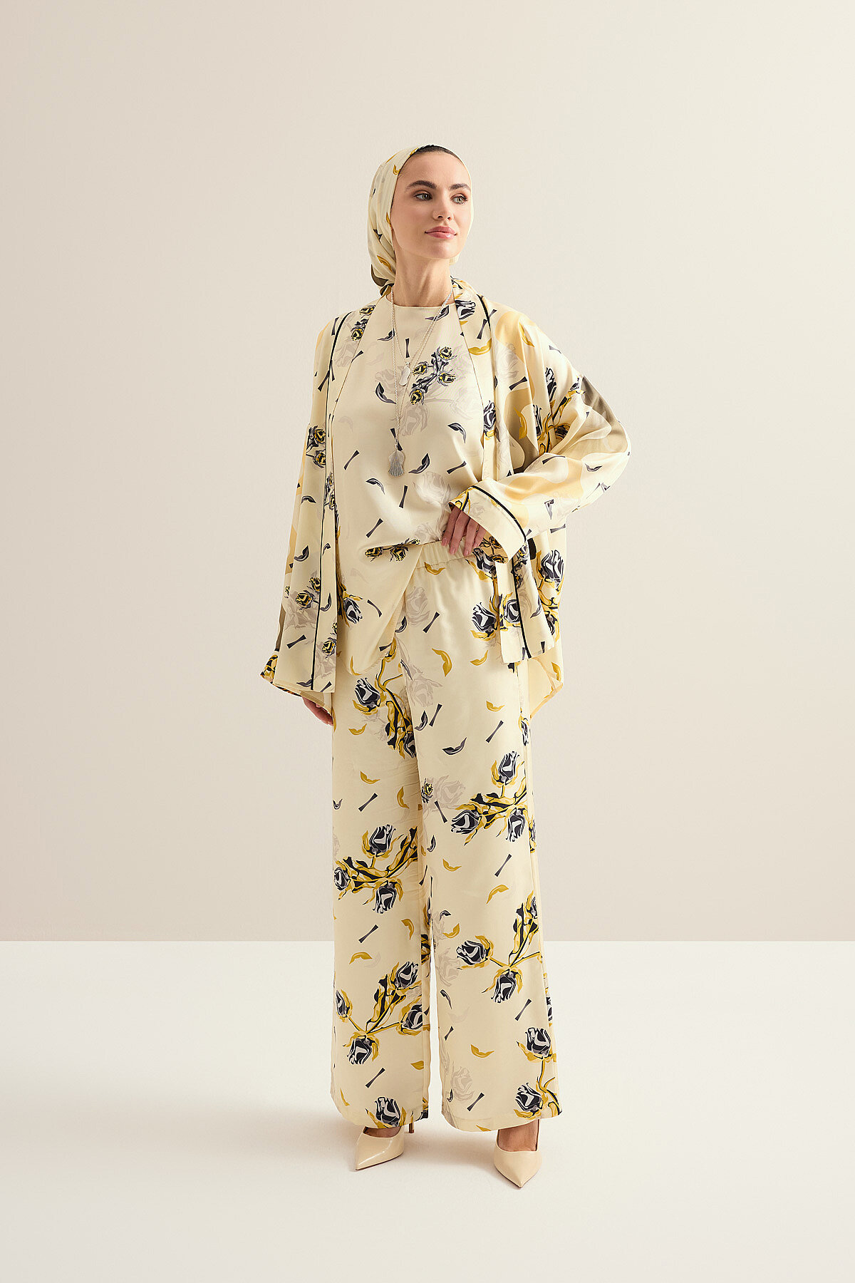 İmannoor’un zarif ve anlam yüklü tasarım anlayışını yansıtan %100 ipek İman’ın Gülü Tivil İpek Pantolon, tivil ipeğin tok ama akışkan dokusu sayesinde vücutta dengeli ve şık bir duruş sunar; gül desenli özel tasarımıyla stile feminen ve sofistike bir karakter kazandırırken, ipeğin doğal parlaklığı lüks bir görünüm sağlar, hafif ve nefes alabilen yapısı gün boyu konfor sunar ve hem günlük şık kombinlerde hem de özel davetlerde zamansız ve iddialı bir parça olarak gardırobunuzda öne çıkar.