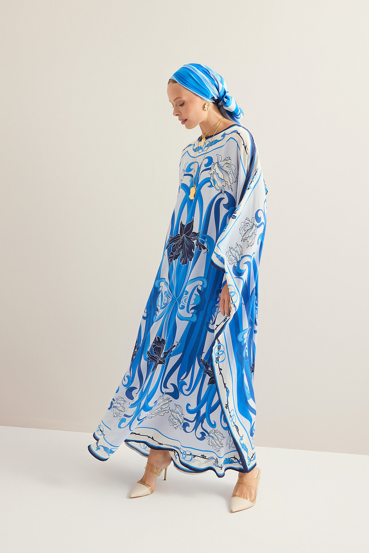 Yeni Dünya deseninin özgün ve etkileyici çizgilerini taşıyan bu krep ipek kaftan, %100 ipek dokusuyla hafif, akıcı ve nefes alan bir kullanım sunar. Tivil ipeğin pürüzsüz yüzeyi ve doğal parlaklığı tasarıma sofistike bir ışıltı kazandırırken, dökümlü ve rahat kesimi gün boyu konfor sağlar. Hem özel davetlerde hem de şık günlük kombinlerde zarif ve güçlü bir siluet oluşturan bu model, zamansız estetiği modern bir yorumla buluşturur.