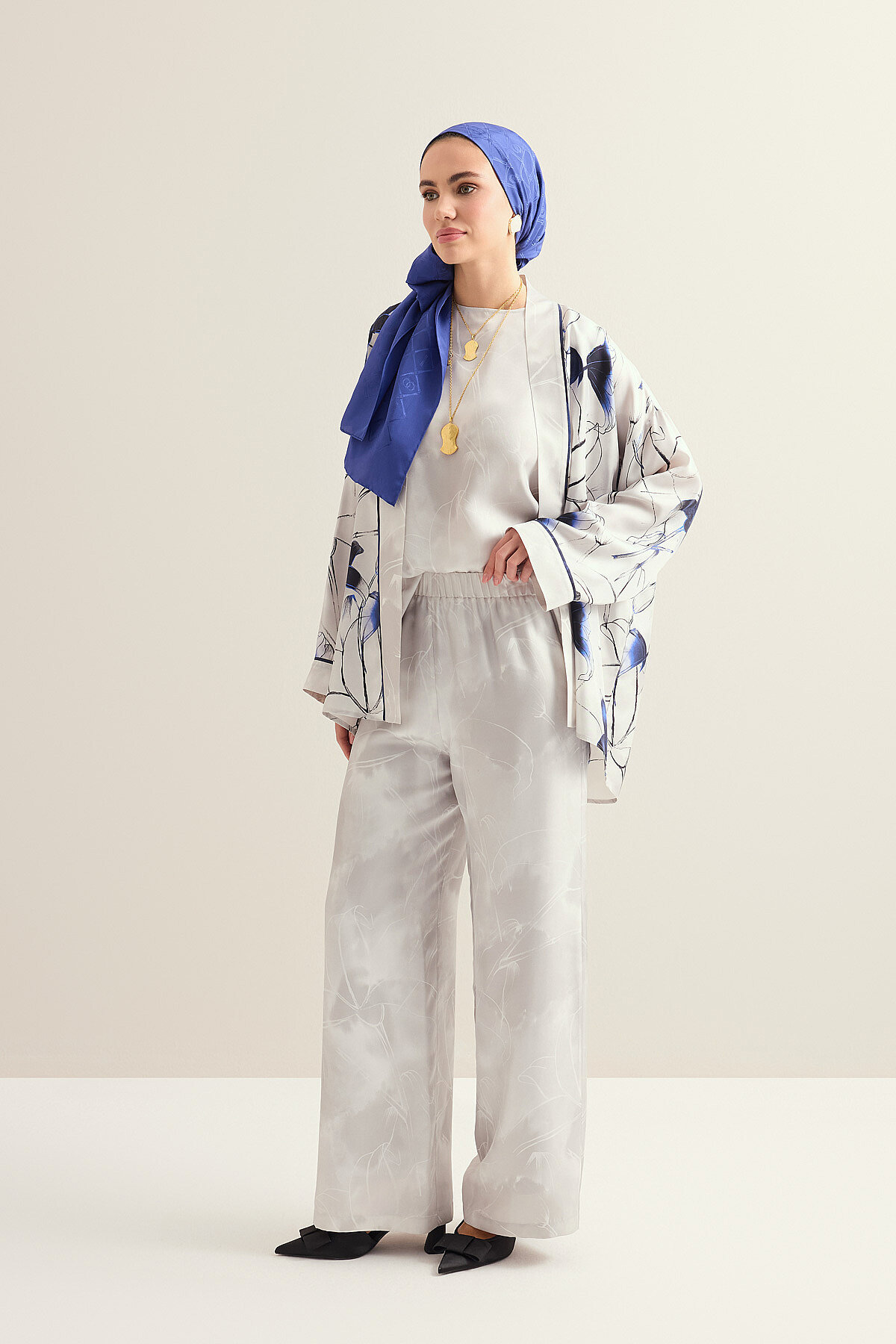 İmannoor’un doğadan ilham alan şiirsel tasarım anlayışını yansıtan %100 ipek Zambaklar Açarken Tivil İpek Pantolon, tivil ipeğin tok ama akışkan dokusu sayesinde vücutta zarif ve dengeli bir duruş sunar; zambak desenli özel tasarımıyla stile ferah, feminen ve sofistike bir karakter kazandırırken, ipeğin doğal parlaklığı lüks bir görünüm sağlar, hafif ve nefes alabilen yapısı gün boyu konfor sunar ve hem günlük şık kombinlerde hem de özel davetlerde zamansız bir parça olarak gardırobunuzda öne çıkar.